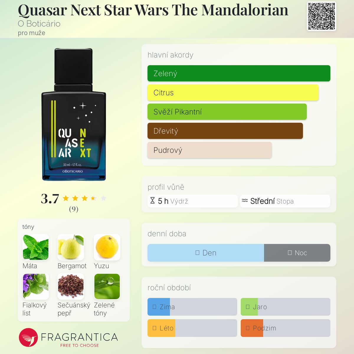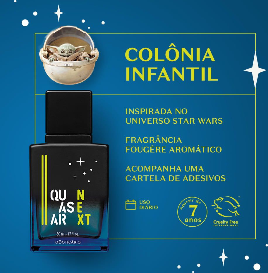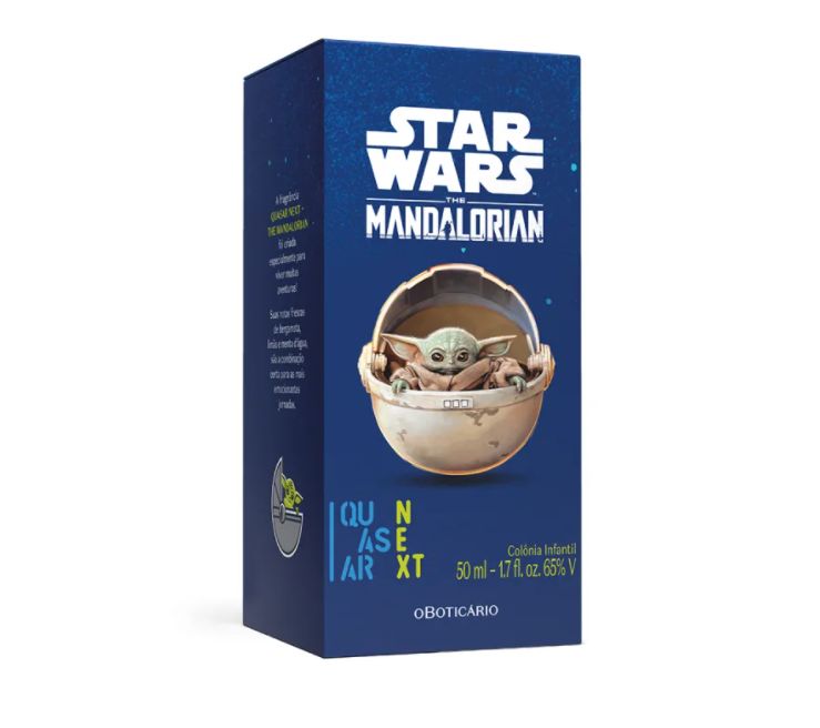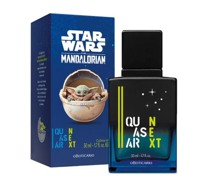 Quasar Next Star Wars The Mandalorian podle O Boticário je Aromatic Fougere vůně pro muže. Quasar Next Star Wars The Mandalorian byl/a uveden/a v roce 2021. "Nosem" za touto vůní je Leonardo Lucheze. Vrchní tóny jsou Vodní máta, Bergamot, Yuzu a Fialkový list; střední tóny jsouSečuánský pepř, Pikantní máta a Bylinné tóny ; základní tóny jsou Santalové dřevo, Atlasový cedr a Pižmo.