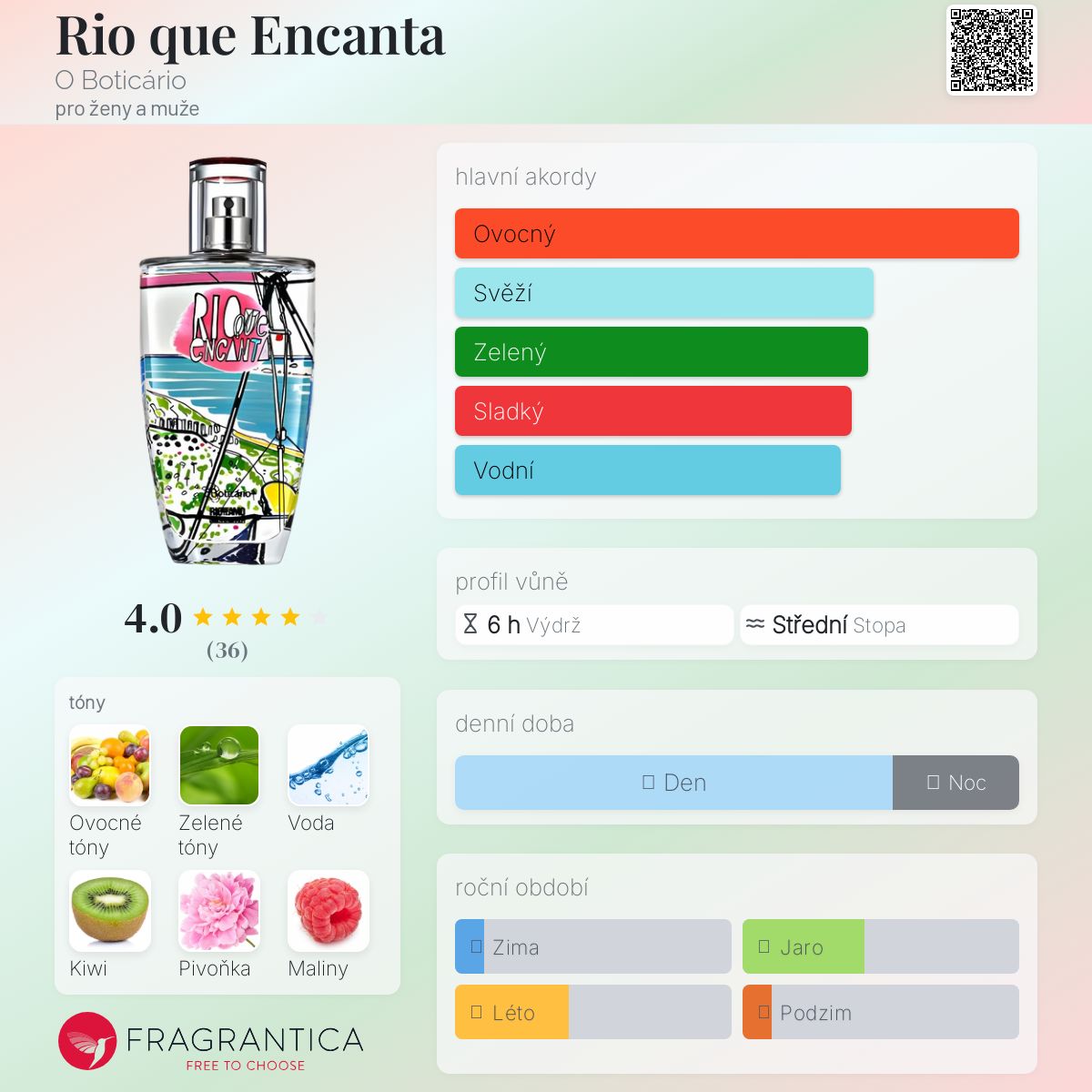 Rio que Encanta podle O Boticário je Floral Fruity vůně pro ženy a muže. Rio que Encanta byl/a uveden/a v roce 2014. "Nosem" za touto vůní je Povo Carioca. Vrchní tóny jsou Ovoce, Vodní tóny, Kiwi a Maliny; střední tóny jsouZelené tóny, Pivoňka, Frézie a Galbanum ; základní tóny jsou Kumarin, Cedr a Jantar (ambra).