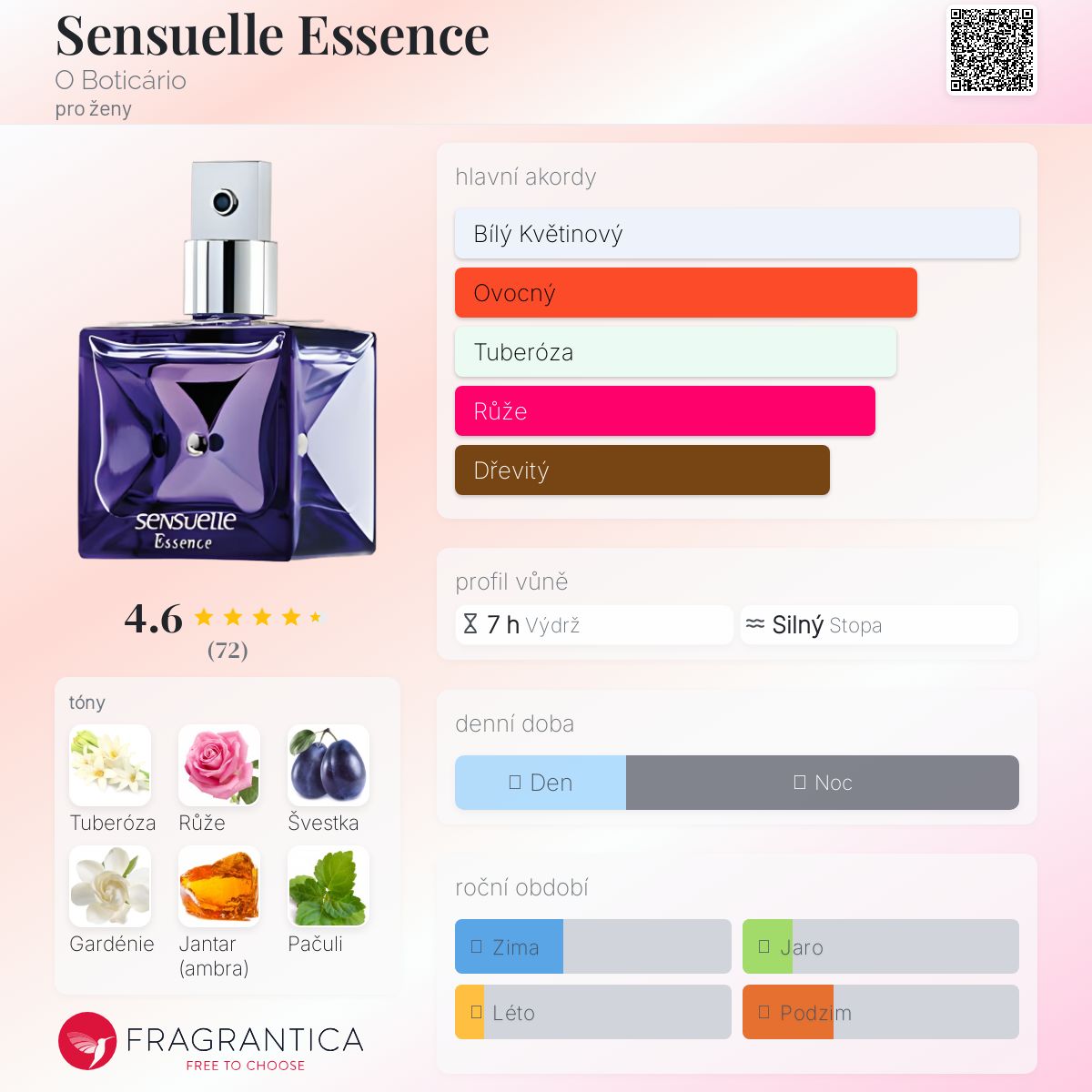 Sensuelle Essence podle O Boticário je Chypre Floral vůně pro ženy. Sensuelle Essence byla spuštěna během 2000. Vrchní tóny jsou Švestka, Broskev, Mandarinka a Bergamot; střední tóny jsouTuberóza, Růže, Gardénie, Kosatec, Ylang-Ylang a Konvalinka ; základní tóny jsou Jantar (ambra), Pačuli, Santalové dřevo, Pižmo a Dubový mech.