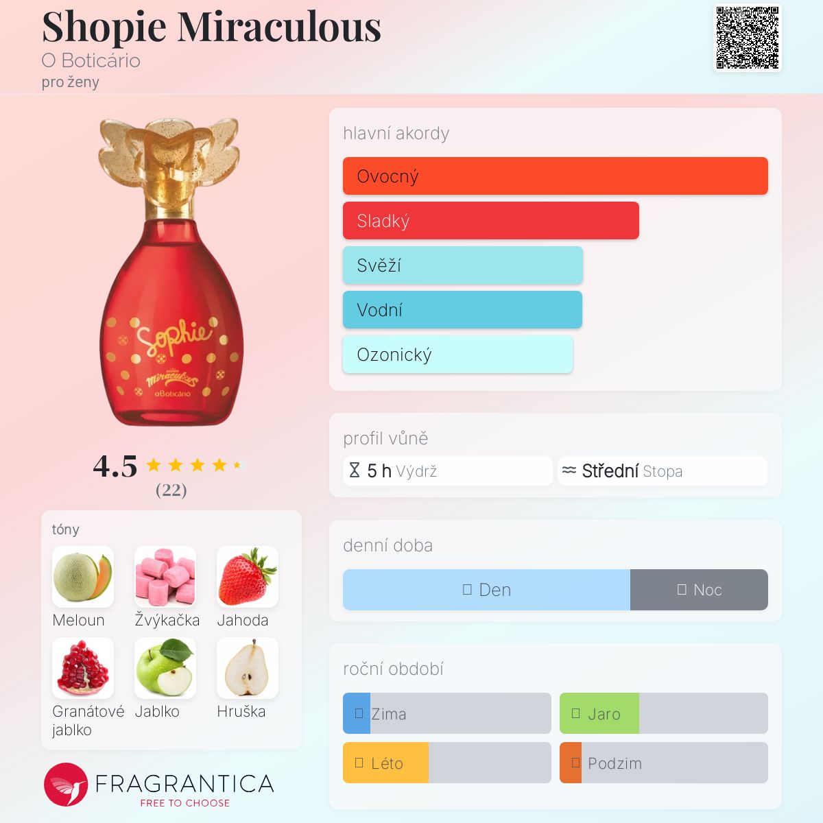Shopie Miraculous podle O Boticário je Floral Fruity Gourmand vůně pro ženy. Shopie Miraculous byl/a uveden/a v roce 2020. "Nosem" za touto vůní je Leslie Gauthier. Vrchní tóny jsou Meloun, Jablko, Hruška a Mandarinka; střední tóny jsouŽvýkačka, Jahoda, Granátové jablko, Růže a Fialka ; základní tóny jsou Vanilka, Pižmo a Kašmír.
