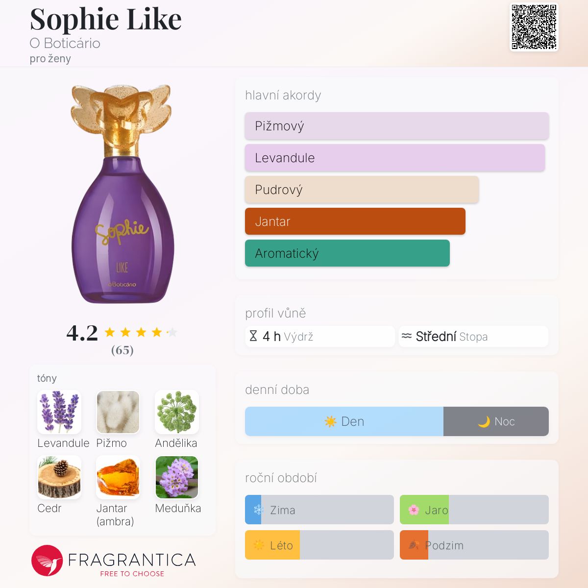 Sophie Like podle O Boticário je Aromatic vůně pro ženy. Sophie Like byl/a uveden/a v roce 2018. "Nosem" za touto vůní je Joachim Correl. Vrchní tón je Levandule ; střední tóny jsouLevandule, Andělika a Meduňka ; základní tóny jsou Pižmo, Cedr a Jantar (ambra).