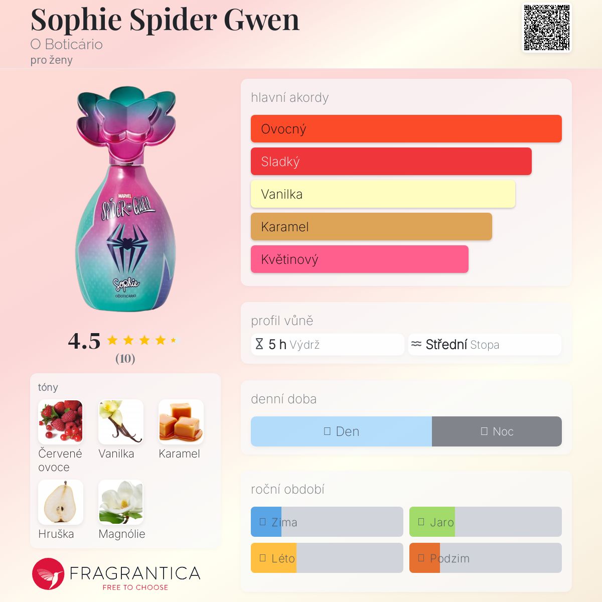 Sophie Spider Gwen podle O Boticário je Orientální Floral vůně pro ženy. Toto je nová vůně. Sophie Spider Gwen byl/a uveden/a v roce 2025. Vrchní tóny jsou Červené ovoce a Hruška; střední tón jeMagnólie ; základní tóny jsou Vanilka a Karamel.