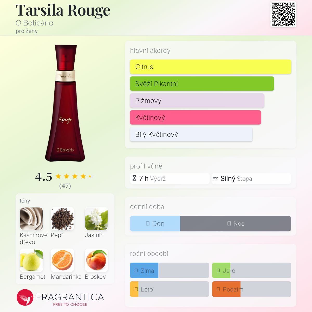 Tarsila Rouge podle O Boticário je Orientální vůně pro ženy. Tarsila Rouge byl/a uveden/a v roce 2006. Tarsila Rouge byl/a vytvořen/a Jean-Pierre Bethouart a Eurico Mazzini. Vrchní tóny jsou Černý pepř, Bergamot, Mandarinka a Broskev; střední tóny jsouJasmín, Magnólie a Lotus ; základní tóny jsou Kašmírové dřevo, Pižmo a Vanilka.
