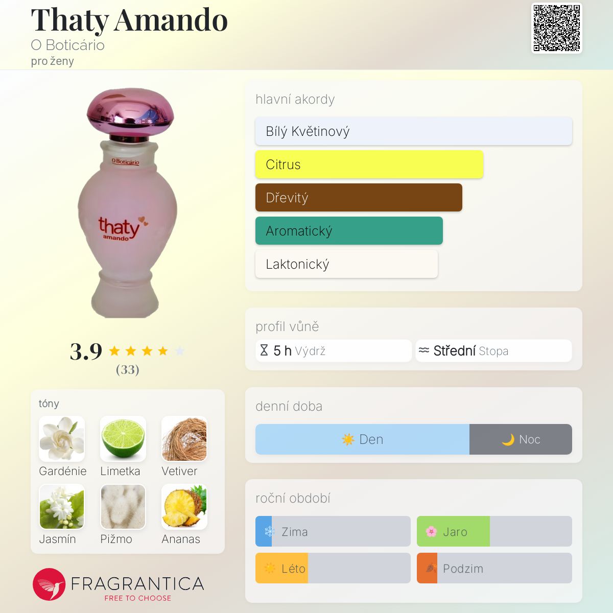 Thaty Amando podle O Boticário je Floral Fruity vůně pro ženy. Thaty Amando byl/a uveden/a v roce 2004. Vrchní tóny jsou Limetka, Ananas a Bergamot; střední tóny jsouGardénie, Jasmín a Fialka ; základní tóny jsou Vetiver, Pižmo, Pačuli, Santalové dřevo a Vanilka.