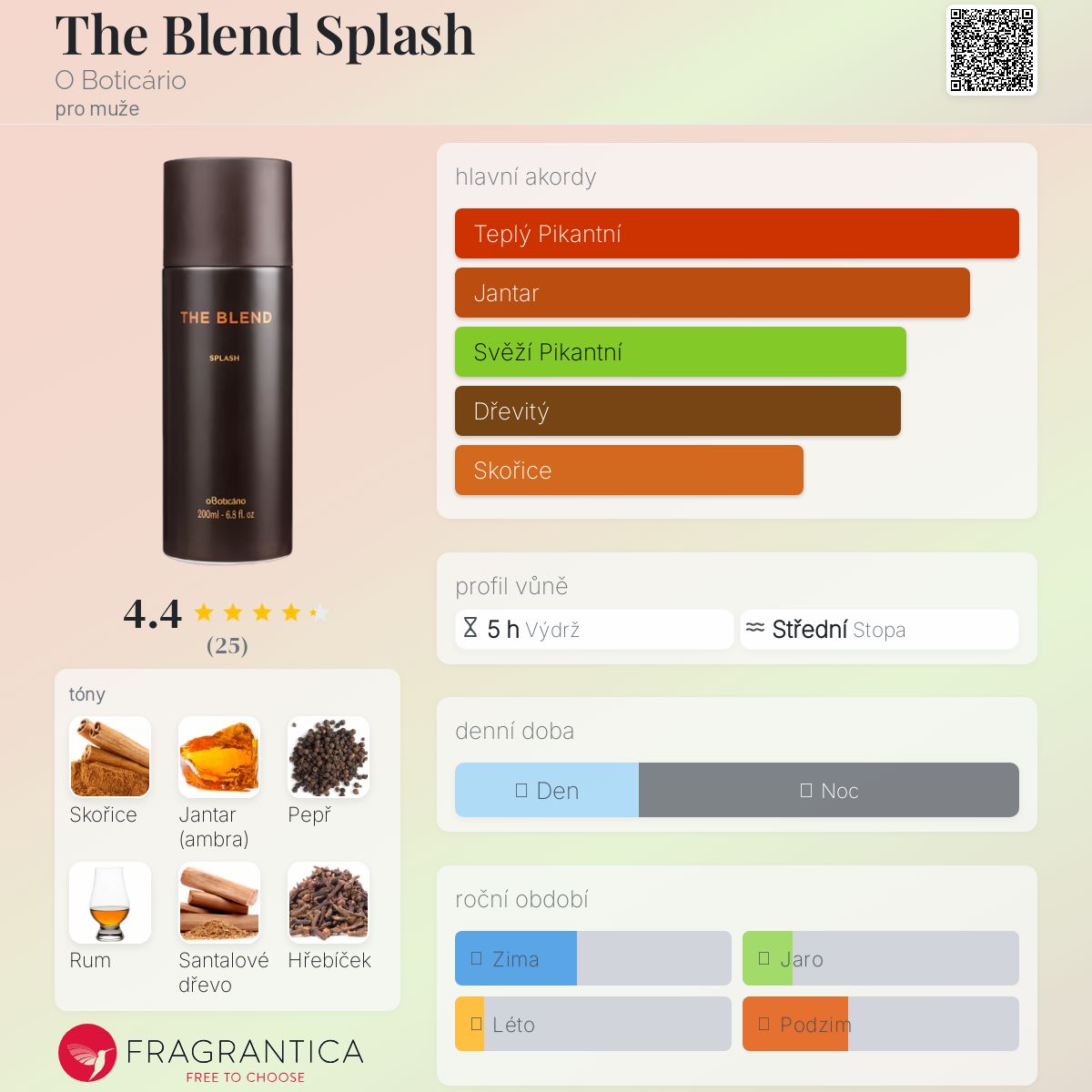 The Blend Splash podle O Boticário je Woody Spicy vůně pro muže. The Blend Splash byl/a uveden/a v roce 2020. Vrchní tóny jsou Rum, Grapefruit, Levandule, Bergamot a Šafrán; střední tóny jsouSkořice, Pepř, Santalové dřevo, Hřebíček, Muškátový oříšek, Pryskyřice, Tuberóza, Kosatec a Vetiver ; základní tóny jsou Jantar (ambra), Fazole tonka, Benzoin, Guajakové dřevo, Mech a Laoský oud.