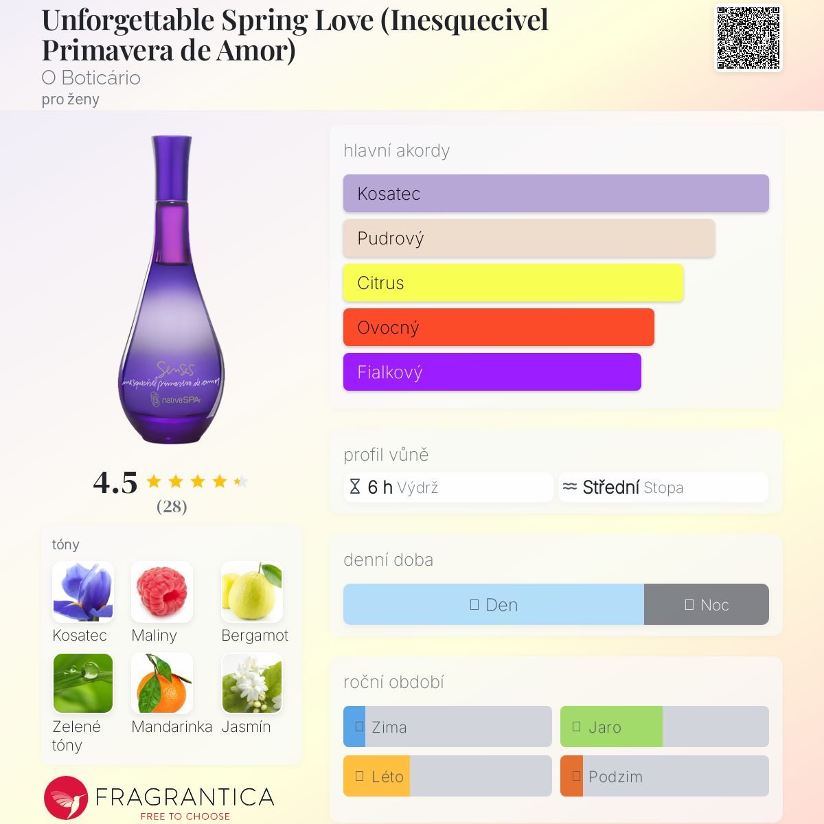 Unforgettable Spring Love (Inesquecivel Primavera de Amor) podle O Boticário je Floral Fruity vůně pro ženy. Unforgettable Spring Love (Inesquecivel Primavera de Amor) byl/a uveden/a v roce 2013. Vrchní tóny jsou Bergamot, Zelené tóny, Mandarinka a Frézie; střední tóny jsouKosatec, Jasmín, Damašská růže a Konvalinka ; základní tóny jsou Maliny, Jantar (ambra), Pižmo a Santalové dřevo.