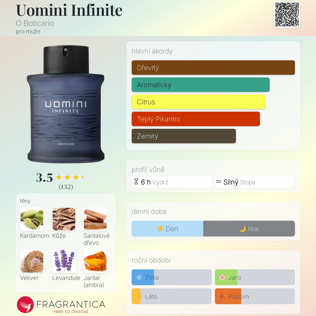 Uomini Infinite podle O Boticário je Woody Spicy vůně pro muže. Uomini Infinite byl/a uveden/a v roce 2022. Vrchní tóny jsou Kardamom, Kovové tóny, Sicilský citron, Pomeranč, Bergamot, Mandarinka a Ananas; střední tóny jsouKůže, Levandule a Jasmín ; základní tóny jsou Santalové dřevo, Vetiver, Jantar (ambra), Cedr, Dubový mech, Pižmo, Pačuli, Labdanum a Vanilka.