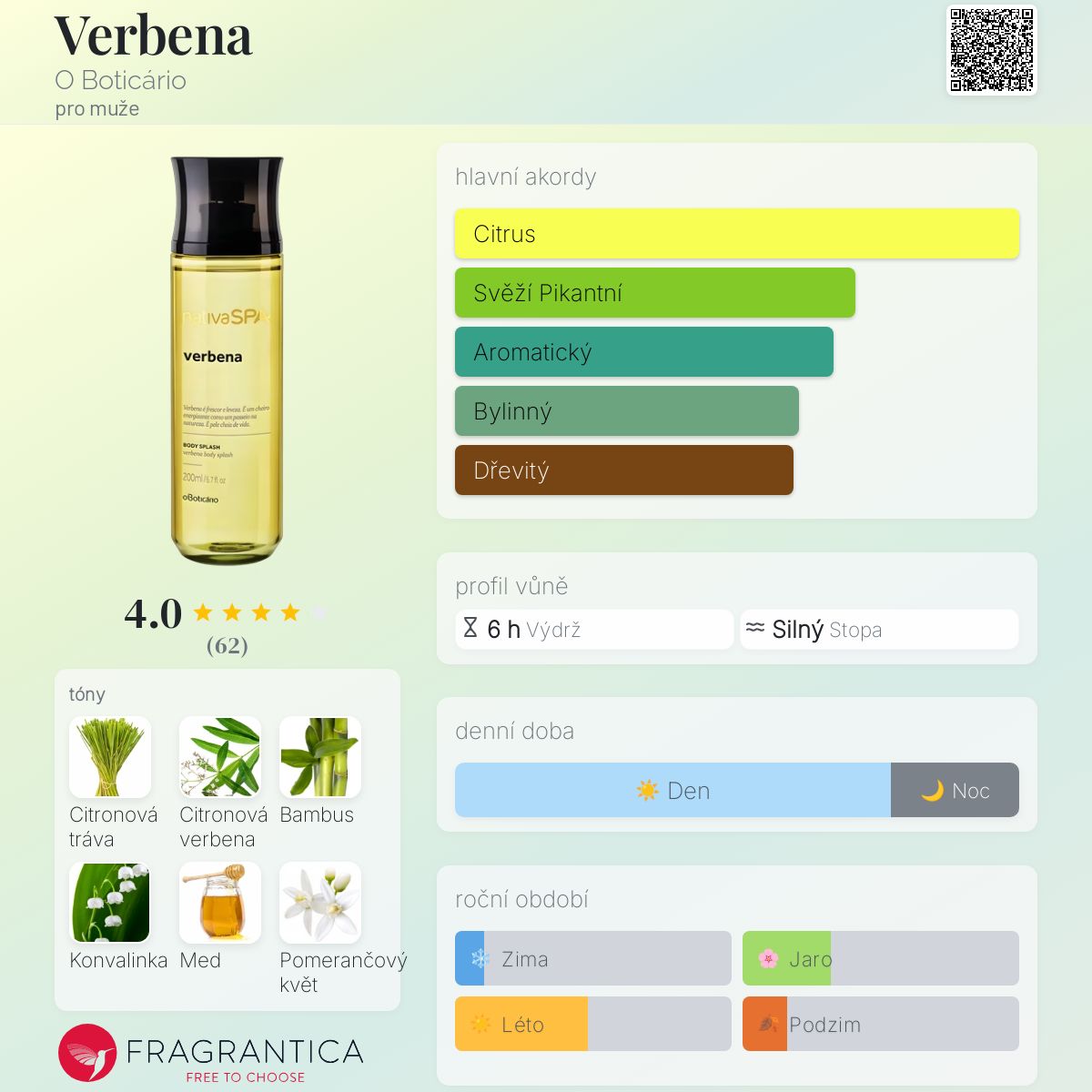 Verbena podle O Boticário je Aromatic Green vůně pro muže. Verbena byl/a uveden/a v roce 2018. "Nosem" za touto vůní je Magali Lara. Vrchní tóny jsou Citronová tráva, Sporýš, Bazalka, Frézie a Jablko; střední tóny jsouBambus, Konvalinka a Pomerančový květ ; základní tóny jsou Med, Vetiver, Cedr a Jantar (ambra).