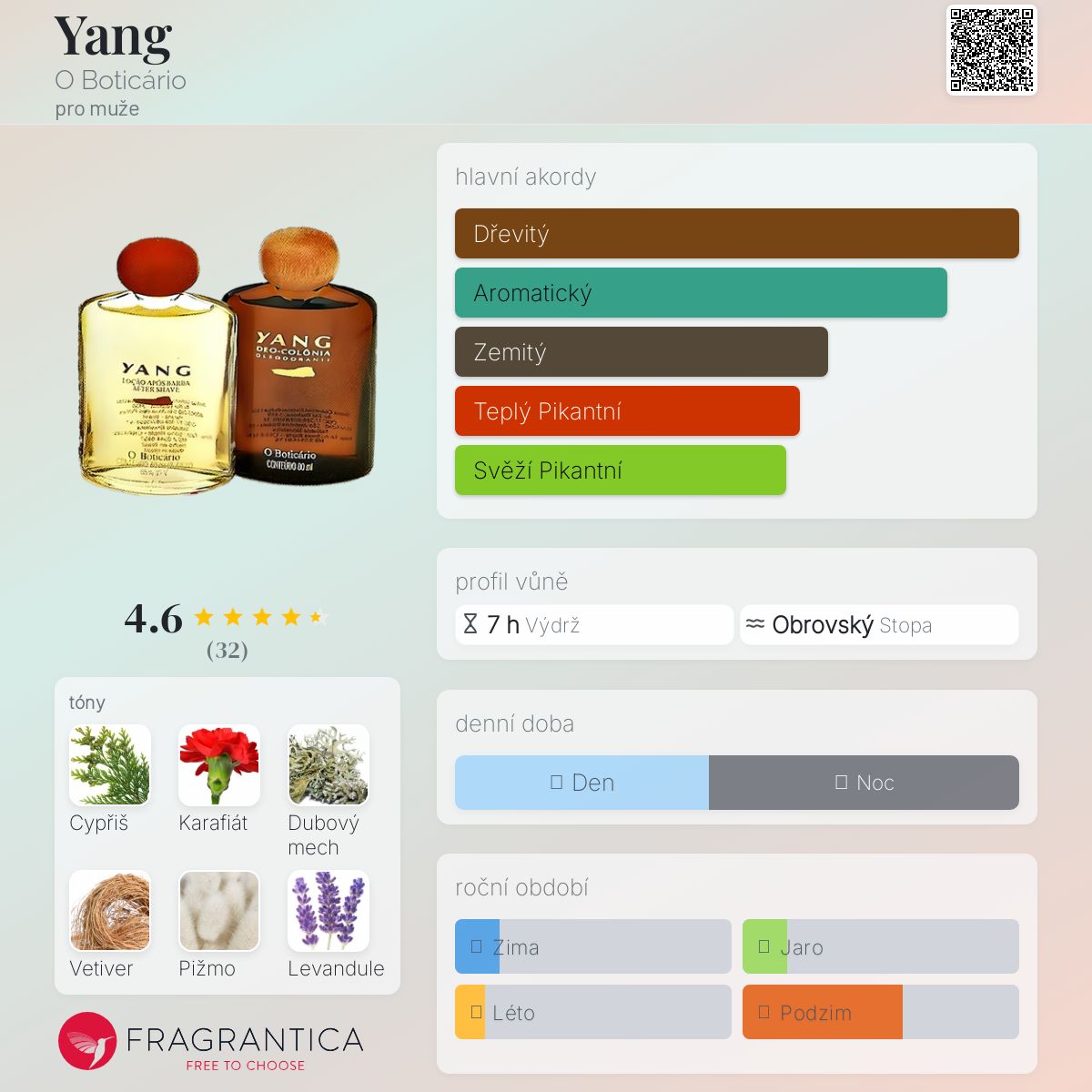 Yang podle O Boticário je Woody Aromatic vůně pro muže. Yang byl/a uveden/a v roce 1991. Vrchní tóny jsou Cypřiš, Levandule a Bergamot; střední tóny jsouKarafiát a Levandule ; základní tóny jsou Dubový mech, Vetiver, Pižmo, Santalové dřevo a Pačuli.