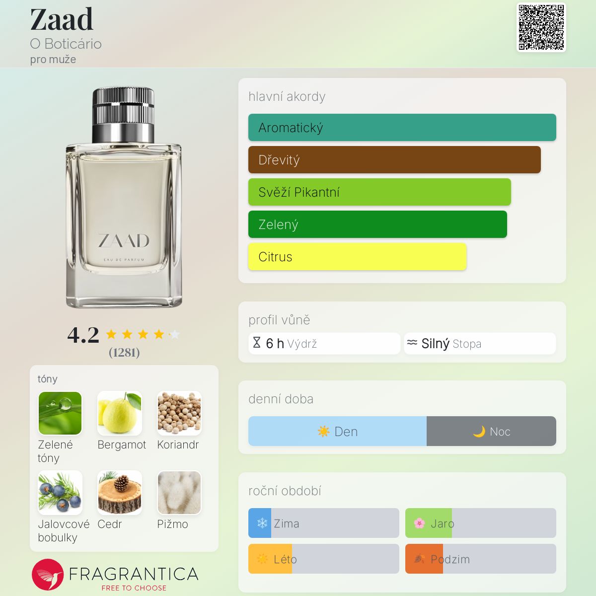 Zaad podle O Boticário je Woody Aromatic vůně pro muže. Zaad byl/a uveden/a v roce 2006. "Nosem" za touto vůní je Thierry Bessard. Vrchní tóny jsou Zelené tóny, Bergamot, Koriandr a Jalovcové bobulky; střední tóny jsouCedr, Indonéský muškátový oříšek, Karafiát, Pačuli a Orchidej ; základní tóny jsou Pižmo, Srbský dubový mech, Australské santalové dřevo a Jantar (ambra).