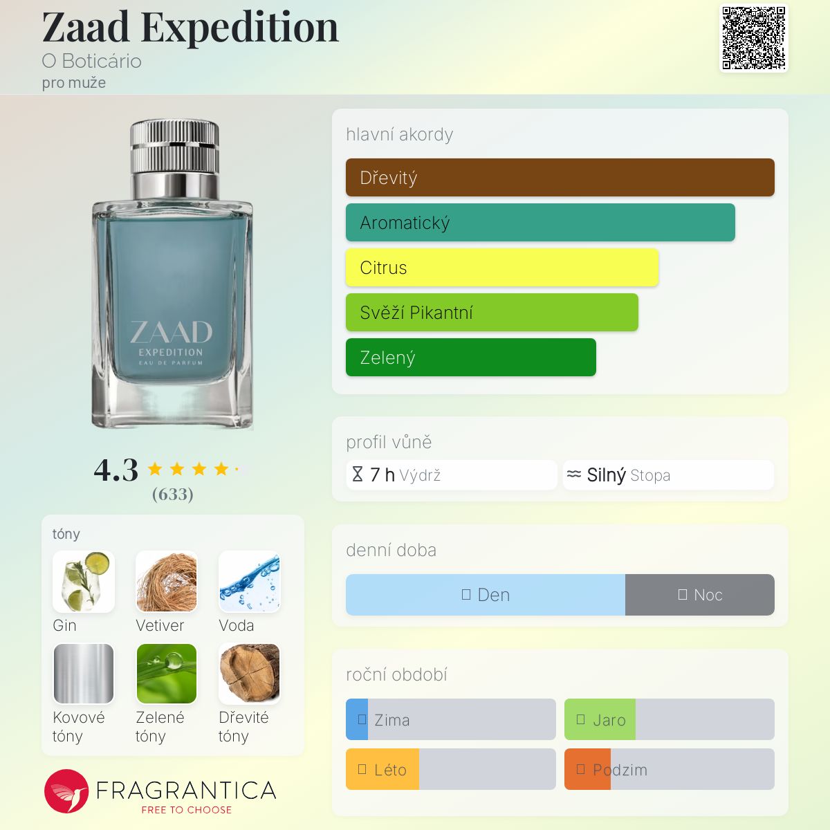 Zaad Expedition podle O Boticário je Woody Aromatic vůně pro muže. Zaad Expedition byl/a uveden/a v roce 2022. Vrchní tóny jsou Gin, Vodní tóny, Zelené tóny, Bergamot, Pomeranč, Grapefruit, Mandarinka, Jablko a Tymián; střední tóny jsouŠalvěj, Dub, Černý pepř, Rozmarýn, Muškátový oříšek, Fialka a Růže ; základní tóny jsou Vetiver, Kovové tóny, Dřevité tóny, Cedr, Santalové dřevo, Pačuli, Pižmo, Kůže a Jantar (ambra).