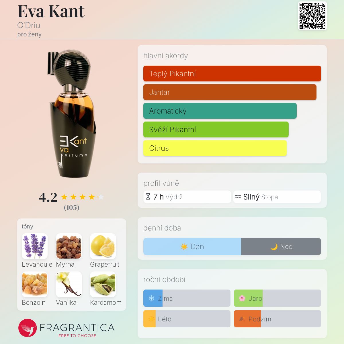 Eva Kant podle O'Driu je Orientální Spicy vůně pro ženy. Eva Kant byl/a uveden/a v roce 2013. "Nosem" za touto vůní je Angelo Orazio Pregoni. Vrchní tóny jsou Levandule, Grapefruit a Dřevité tóny; střední tóny jsouMyrha, Zázvor, Ylang-Ylang, Santalové dřevo a Magnólie ; základní tóny jsou Benzoin, Vanilka, Kardamom a Heřmánek.