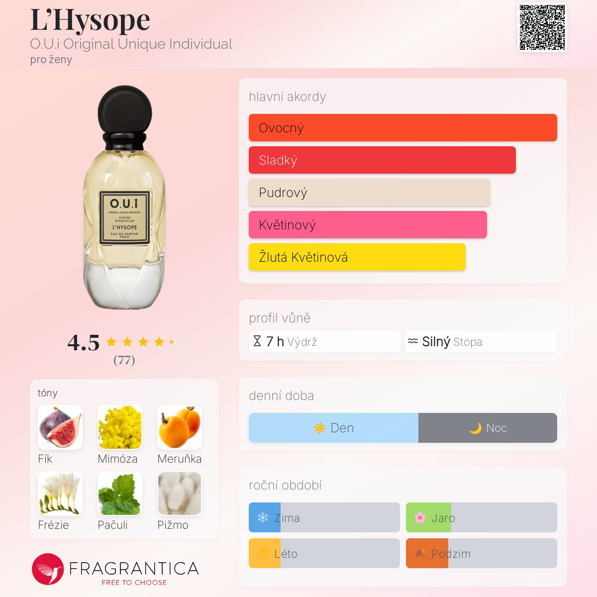 L’Hysope podle O.U.i Original Unique Individual je Floral vůně pro ženy. L’Hysope byl/a uveden/a v roce 2022. Vrchní tóny jsou Fík, Meruňka a Hruška; střední tóny jsouMimóza, Frézie a Jasmín ; základní tóny jsou Pačuli, Pižmo a Labdanum.