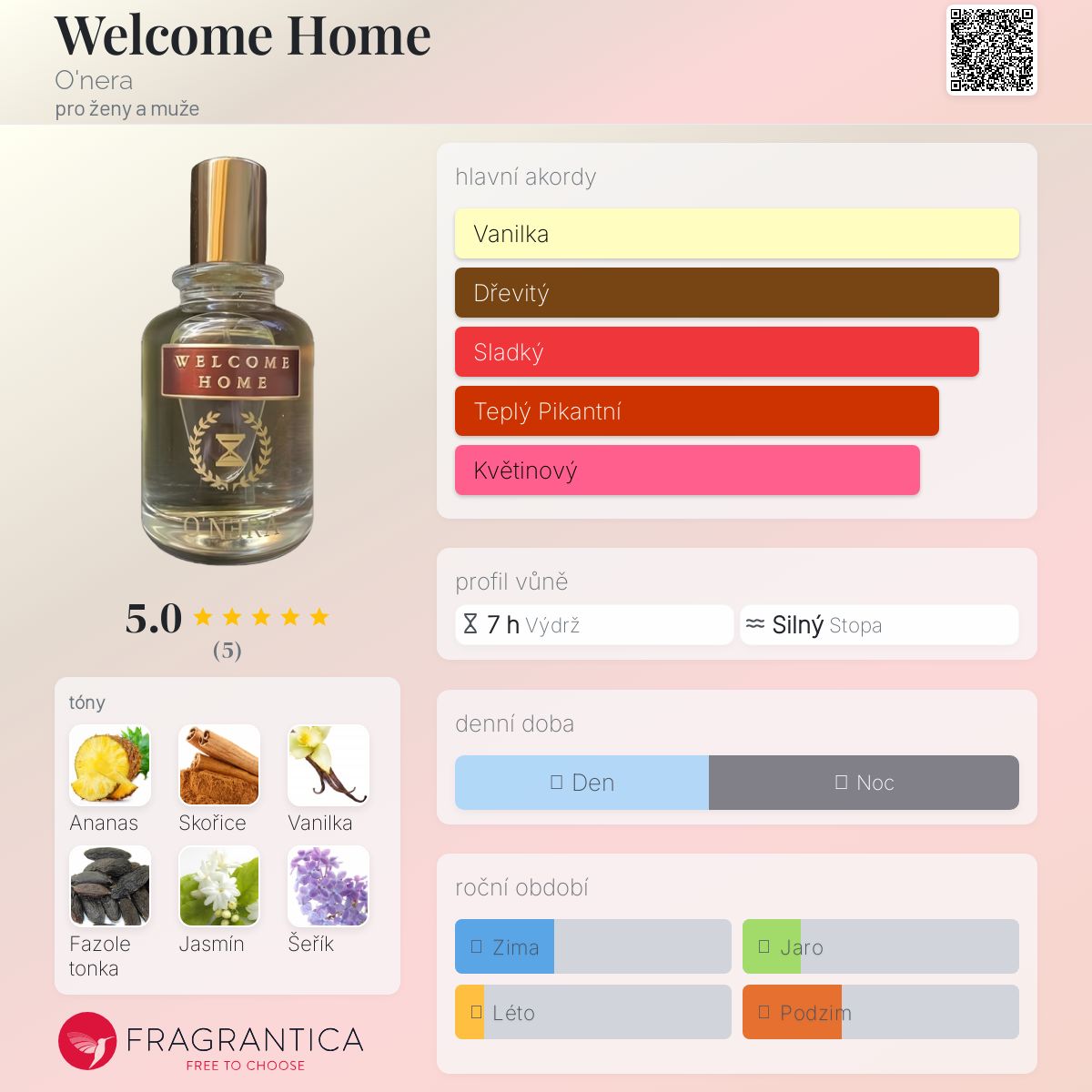 Welcome Home podle O'nera je vůně pro ženy a muže. Welcome Home byl/a uveden/a v roce 2023. Vrchní tóny jsou Ananas, Skořice a Vanilka; střední tóny jsouFazole tonka, Jasmín a Šeřík ; základní tóny jsou Kůže, Cedr a Whisky.