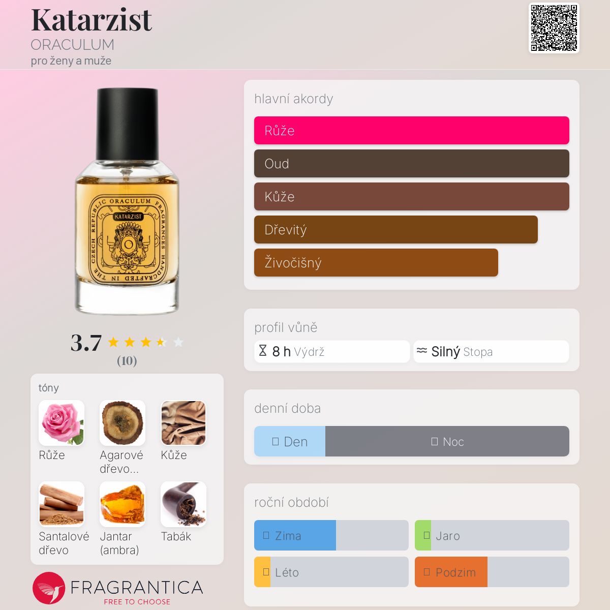 Katarzist podle ORACULUM je vůně pro ženy a muže. Katarzist byl/a uveden/a v roce 2022. Vrchní tóny jsou Santalové dřevo a Tabák; střední tóny jsouRůže a Jantar (ambra) ; základní tóny jsou Agarové dřevo (oud), Kůže a Pižmo.