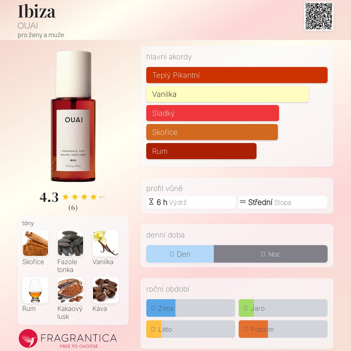 Ibiza podle OUAI je Orientální Vanilla vůně pro ženy a muže. Toto je nová vůně. Ibiza byl/a uveden/a v roce 2025. Vrchní tóny jsou Fazole tonka, Kakao a Cukr; střední tóny jsouKáva, Kašmír a Labdanum ; základní tóny jsou Skořice, Vanilka a Rum.