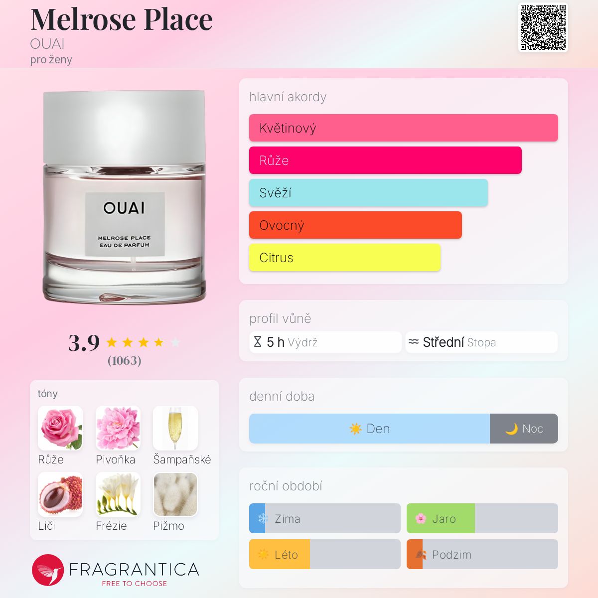 To je pro mě slepý nákup, viděl jsem to na webových stránkách Ouai a nabízeli 15% off a dopravu zdarma. Škoda, že jsem to neprošla, tyhle nabídky mě vždycky dostanou! Celkově je to svěží, čistá, citrusová, ovocná květinová vůně, stejná jako mnoho dalších, které už existují, nic jedinečného ani zvláštního. Už jsem cítila stovky parfémů, které voní podobně. Mám v ní hodně růže, liči & pižma. Je to vůně mýdlová & čistá, ale zároveň ovocná. Voní podobně jako My Burberry, Lancome Idole, Versace Yellow Diamond, ale je jich příliš mnoho na to, abych je vyjmenovala. Voní také téměř stejně jako Ouai North Bondi, mám je teď vedle sebe. Zaplatila jsem za ni asi 60 dolarů, 50 ml, není drahá, ale přála bych si, aby se promítala víc. Je to naprosto blízká vůně kůži. Dokážu si představit, že si ji někdo vezme do práce, do školy (na vysokou), na nákupy, na rande, na jakoukoli příležitost, protože je neškodná & jednoduchá. Budete vonět čistě, svěže & růžově. Pokud máte rádi čisté, citrusové, svěží a růžové parfémy, bude se vám líbit. Osobně bych ji nejraději vynechala, není tu nic jedinečného ani výjimečného, slabá je i projekce.