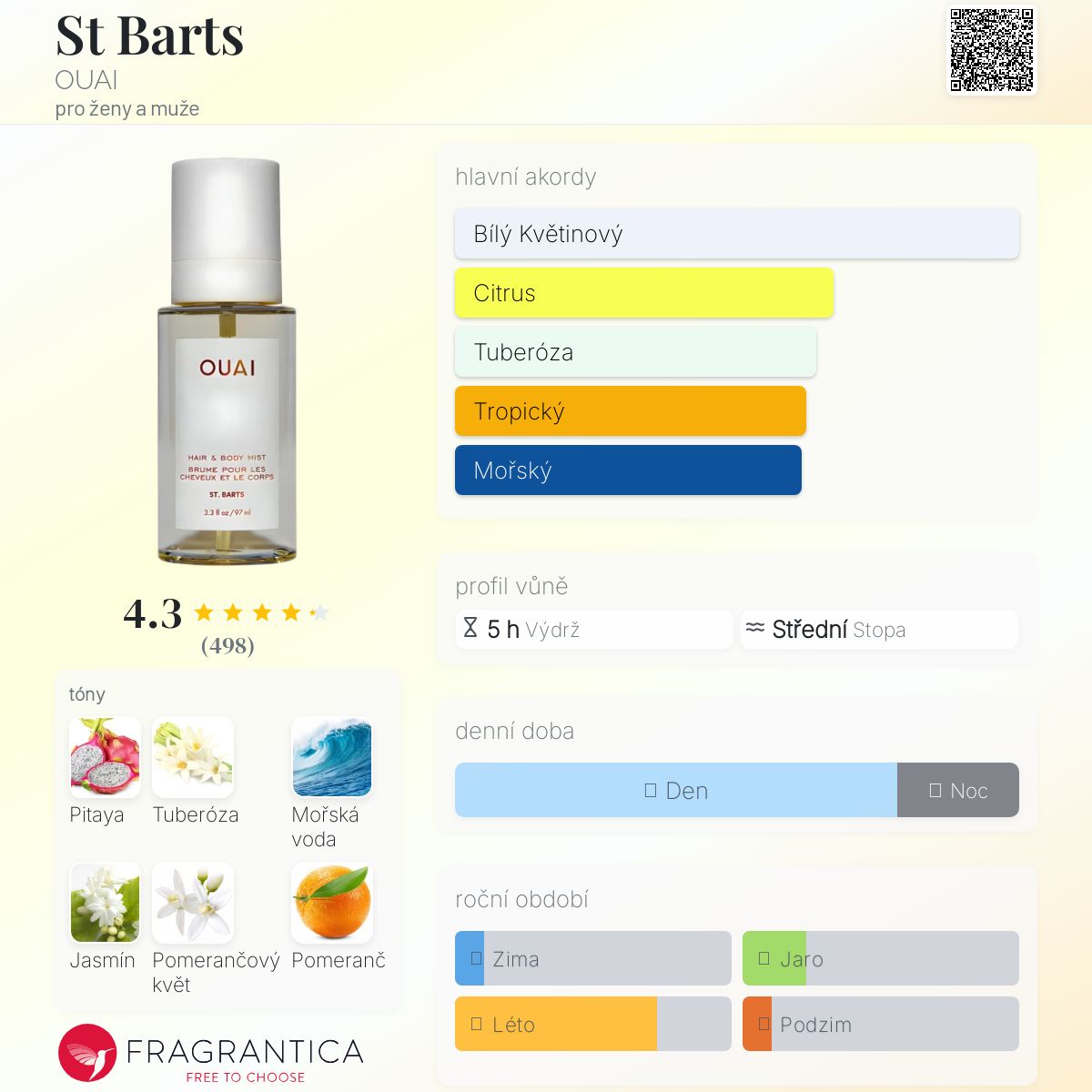 St Barts podle OUAI je vůně pro ženy a muže. Toto je nová vůně. St Barts byl/a uveden/a v roce 2024. Vrchní tóny jsou Pitaya, Mořské tóny a Pomerančový olej; střední tóny jsouTuberóza, Marocký jasmín a Pomerančový květ ; základní tóny jsou Pižmo a Jantar (ambra).