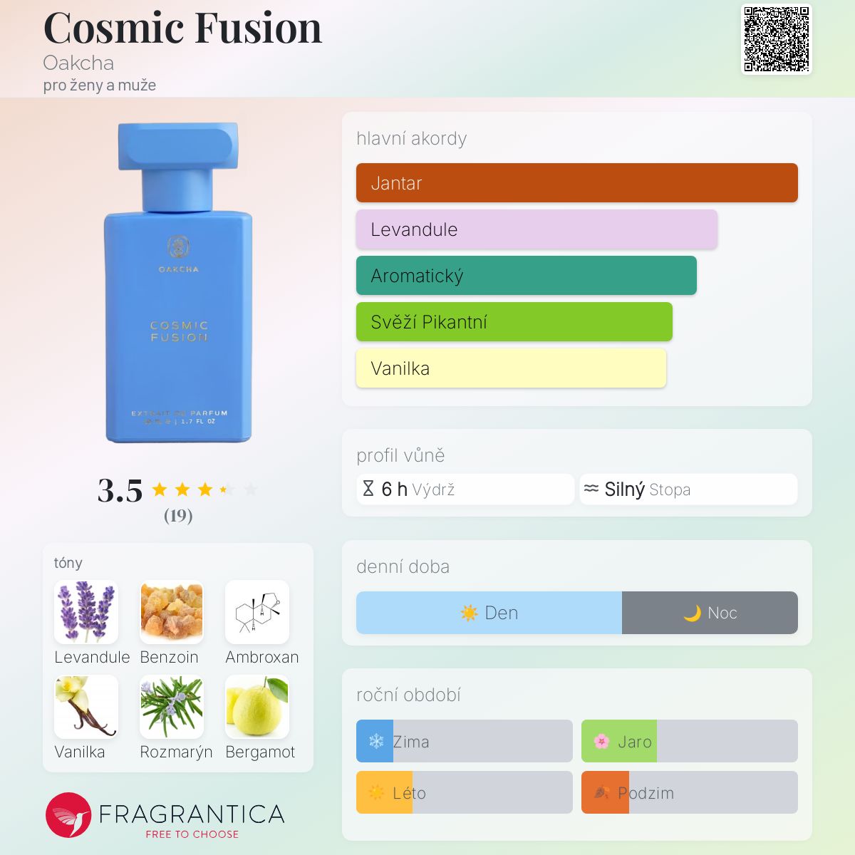 Cosmic Fusion podle Oakcha je vůně pro ženy a muže. Vrchní tóny jsou Rozmarýn, Bergamot a Ananas; střední tóny jsouLevandule a Skořice ; základní tóny jsou Benzoin, Ambroxan, Vanilka a Santalové dřevo.