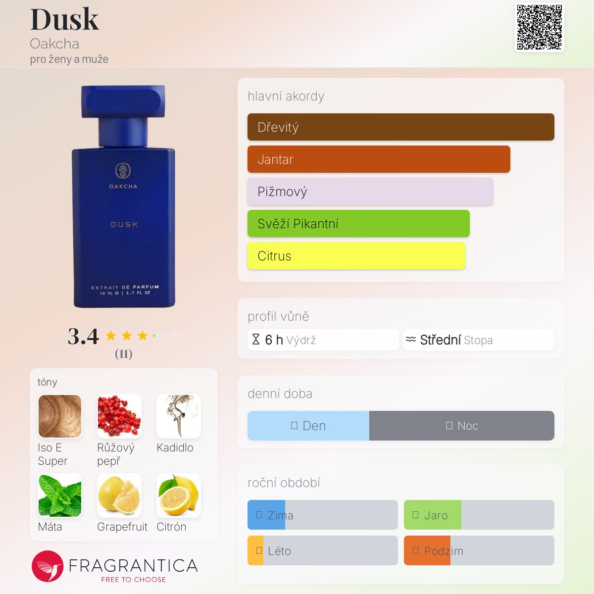 Dusk podle Oakcha je vůně pro ženy a muže. Vrchní tóny jsou Růžový pepř, Máta, Grapefruit a Citrón; střední tóny jsouIso E Super, Zázvor, Jasmín a Muškátový oříšek ; základní tóny jsou Kadidlo, Santalové dřevo, Bílé pižmo, Pačuli, Vetiver, Cedr a Labdanum.