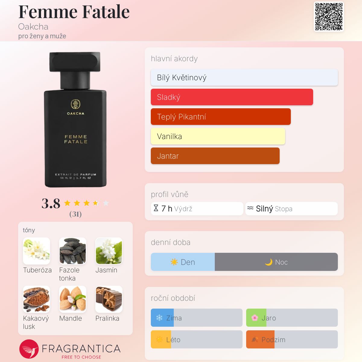 Femme Fatale podle Oakcha je vůně pro ženy a muže. Vrchní tóny jsou Mandle, Bergamot, Káva a Citrón; střední tóny jsouTuberóza, Jasmín Sambac, Pomerančový květ, Bulharská růže a Orris ; základní tóny jsou Fazole tonka, Kakao, Pralinka, Pižmo, Vanilka, Jantar (ambra), Kašmírové dřevo, Skořice, Santalové dřevo, Pačuli a Cedr.
