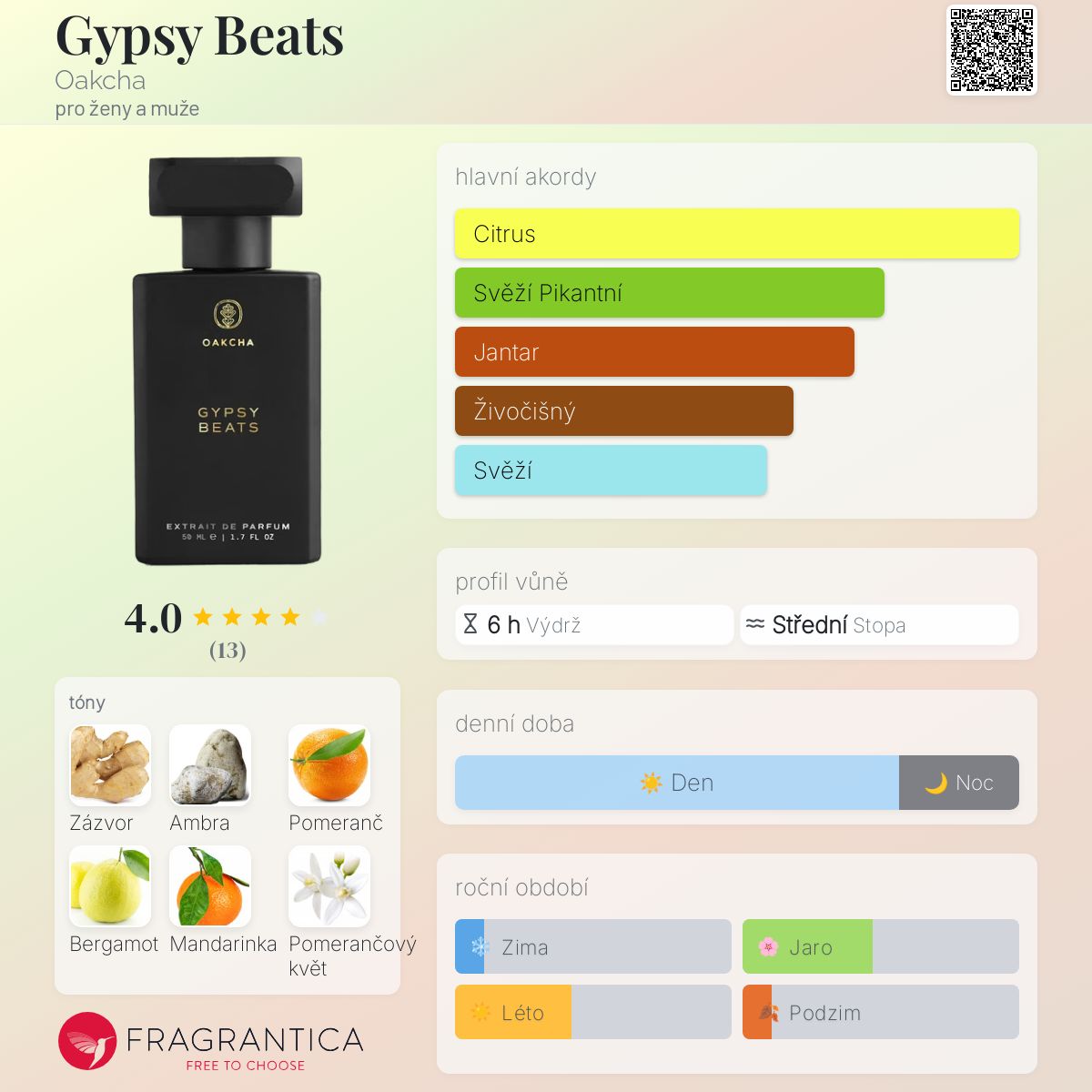 Gypsy Beats podle Oakcha je vůně pro ženy a muže. Vrchní tóny jsou Bergamot, Mandarinka a Pomerančový květ; střední tóny jsouZázvor a Pomeranč ; základní tón je Ambra.