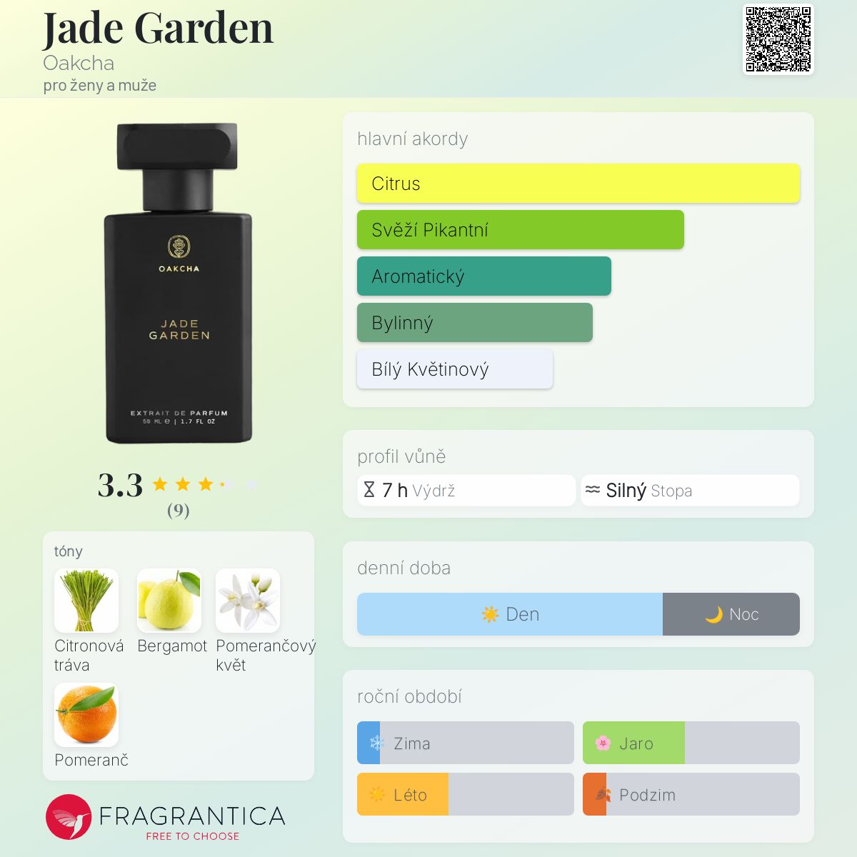 Jade Garden podle Oakcha je vůně pro ženy a muže. Vrchní tón je Citronová tráva ; střední tóny jsouPomerančový květ a Pomeranč ; základní tón je Bergamot.