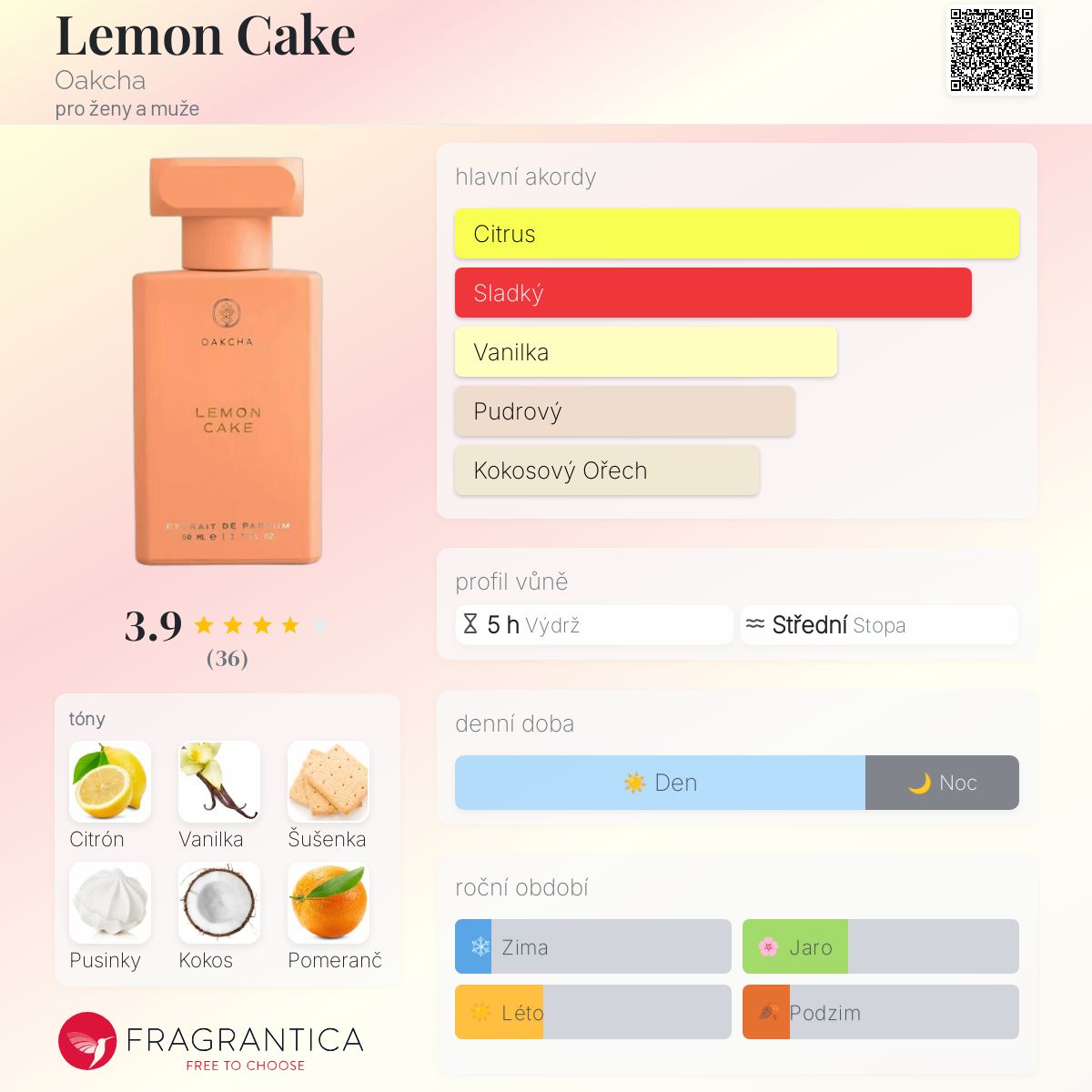 Lemon Cake podle Oakcha je Citrus Gourmand vůně pro ženy a muže. Lemon Cake byl/a uveden/a v roce 2022. Vrchní tóny jsou Citrón, Pomeranč, Limetka a Petitgrain; střední tóny jsouSušenka, Kokos, Pomerančový květ a Mandle ; základní tóny jsou Vanilka, Sněhová pusinka, Karamel, Pižmo a Jantar (ambra).