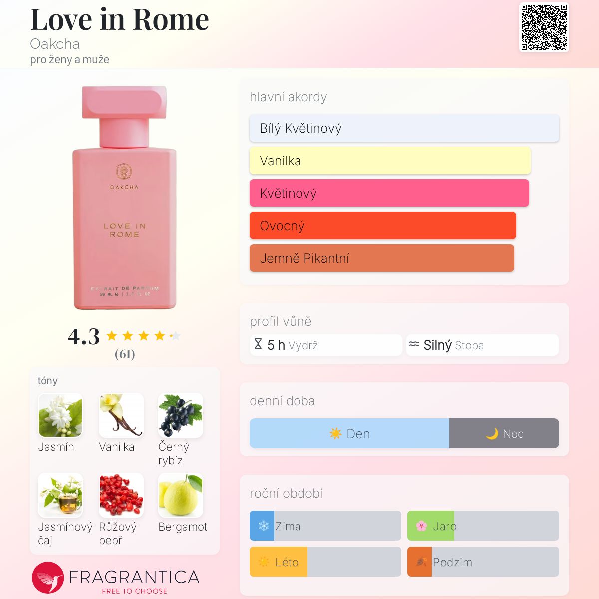 Love in Rome podle Oakcha je vůně pro ženy a muže. Vrchní tóny jsou Černý rybíz, Růžový pepř a Bergamot; střední tóny jsouJasmín Sambac, Jasmín a Jasmínový čaj ; základní tóny jsou Vanilka a Guajakové dřevo.