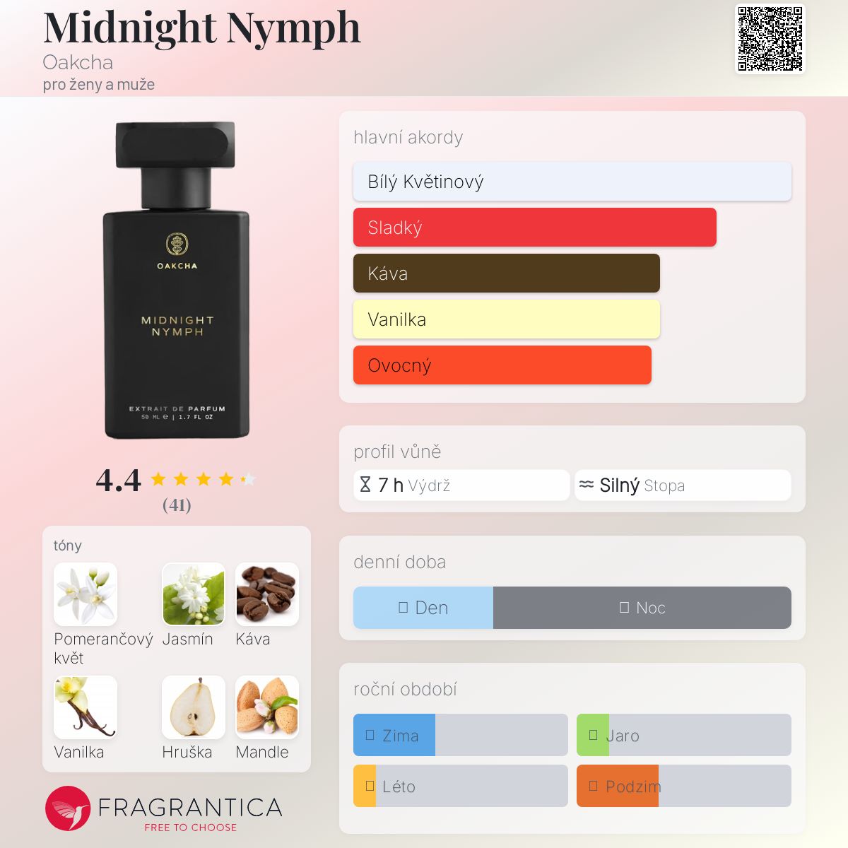 Midnight Nymph podle Oakcha je vůně pro ženy a muže. Vrchní tóny jsou Pomerančový květ, Hruška a Růžový pepř; střední tóny jsouJasmín, Káva, Hořká mandle a Lékořice ; základní tóny jsou Vanilka, Pačuli, Kašmírové dřevo a Cedr.