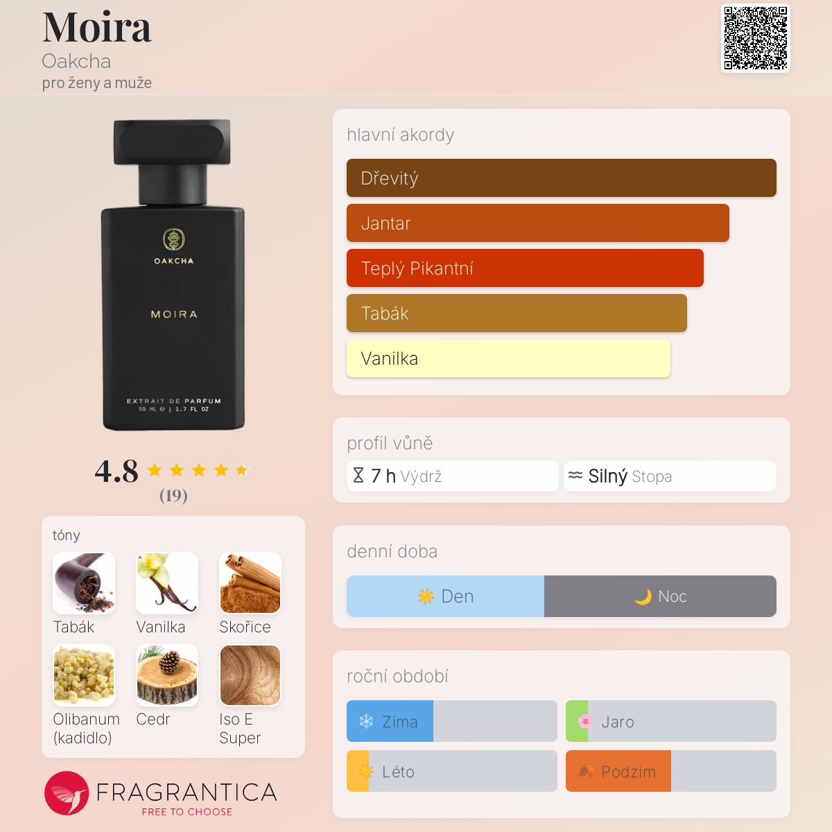 Moira podle Oakcha je vůně pro ženy a muže. Vrchní tóny jsou Skořice a Pepř; střední tóny jsouTabákový list, Kadidlo, Labdanum a Vonokvětka ; základní tóny jsou Vanilkový lusk, Atlasový cedr, Iso E Super, Pačuli, Cypriolový olej, Vetiver a Pižmo.