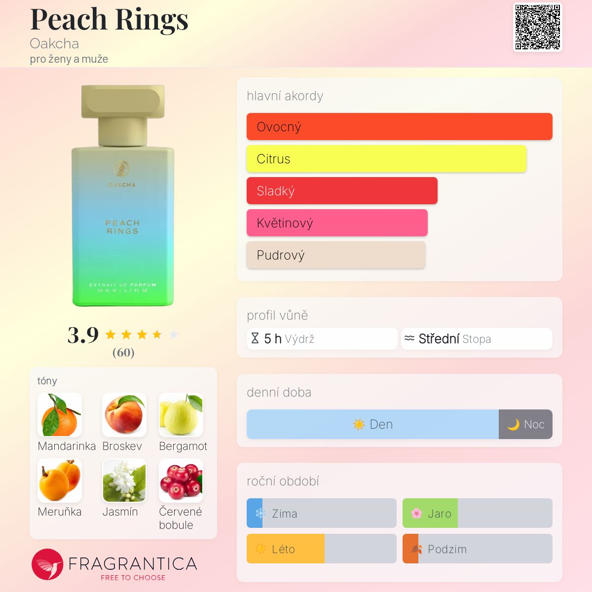 Peach Rings podle Oakcha je vůně pro ženy a muže. Vrchní tóny jsou Mandarinka, Broskev a Bergamot; střední tóny jsouMeruňka, Červené bobule a Vonokvětka ; základní tóny jsou Jasmín, Pižmo a Cedr.