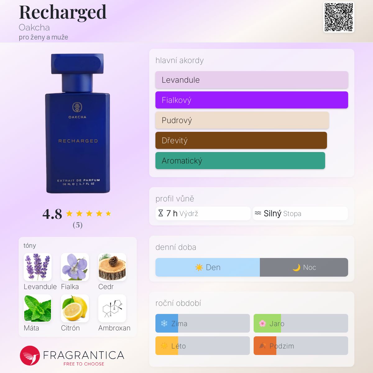 Recharged podle Oakcha je vůně pro ženy a muže. Vrchní tóny jsou Máta peprná, Citrón, Bergamot, Galbanum a Sporýš; střední tóny jsouLevandule, Fialka a Pelargónie ; základní tóny jsou Cedr, Ambroxan, Santalové dřevo a Dubový mech.