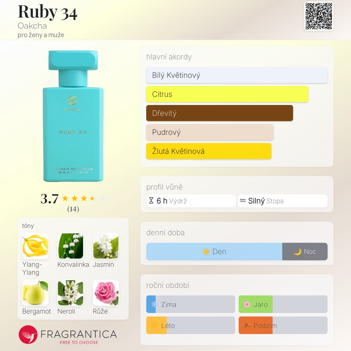 Ruby 34 podle Oakcha je vůně pro ženy a muže. Vrchní tóny jsou Ylang-Ylang, Bergamot, Neroli a Citrón; střední tóny jsouKonvalinka, Jasmín, Růže, Kosatec a Orris ; základní tóny jsou Pižmo, Mech, Santalové dřevo, Pačuli, Vetiver, Jantar (ambra) a Vanilka.
