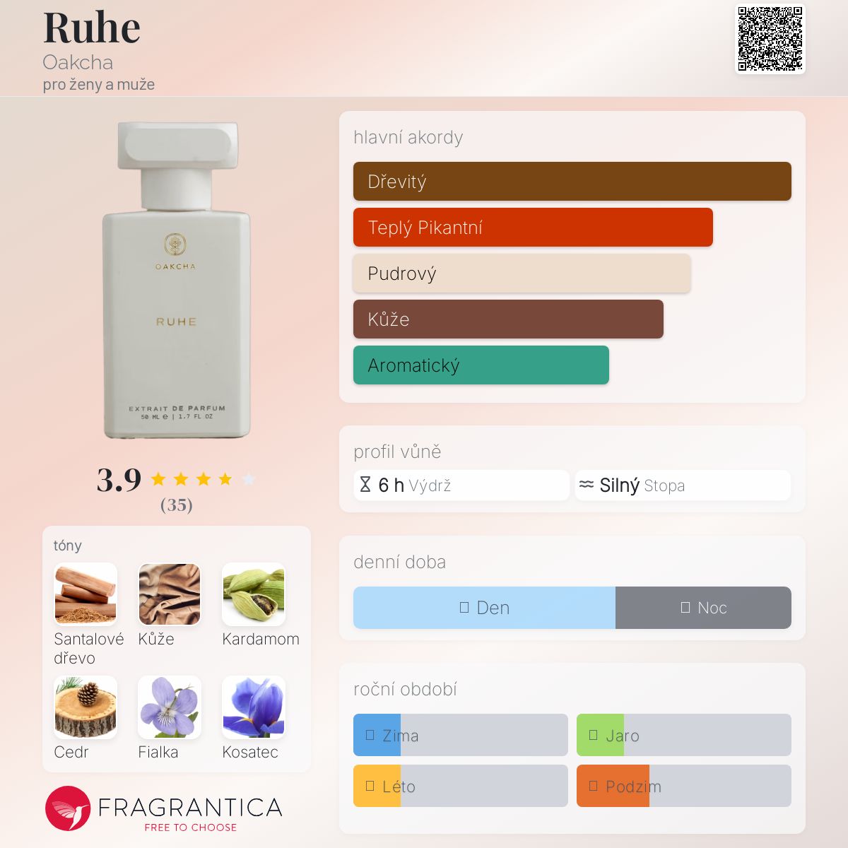 Ruhe podle Oakcha je vůně pro ženy a muže. Vrchní tóny jsou Kardamom a Fialka; střední tón jeKosatec ; základní tóny jsou Santalové dřevo, Kůže a Cedr.