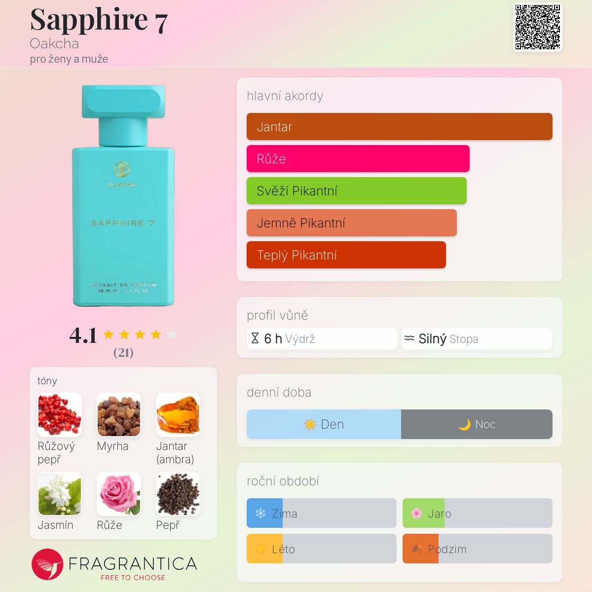 Sapphire 7 podle Oakcha je vůně pro ženy a muže. Vrchní tóny jsou Růžový pepř a Pepř; střední tóny jsouJasmín, Růže a Pelargónie ; základní tóny jsou Myrha a Jantar (ambra).
