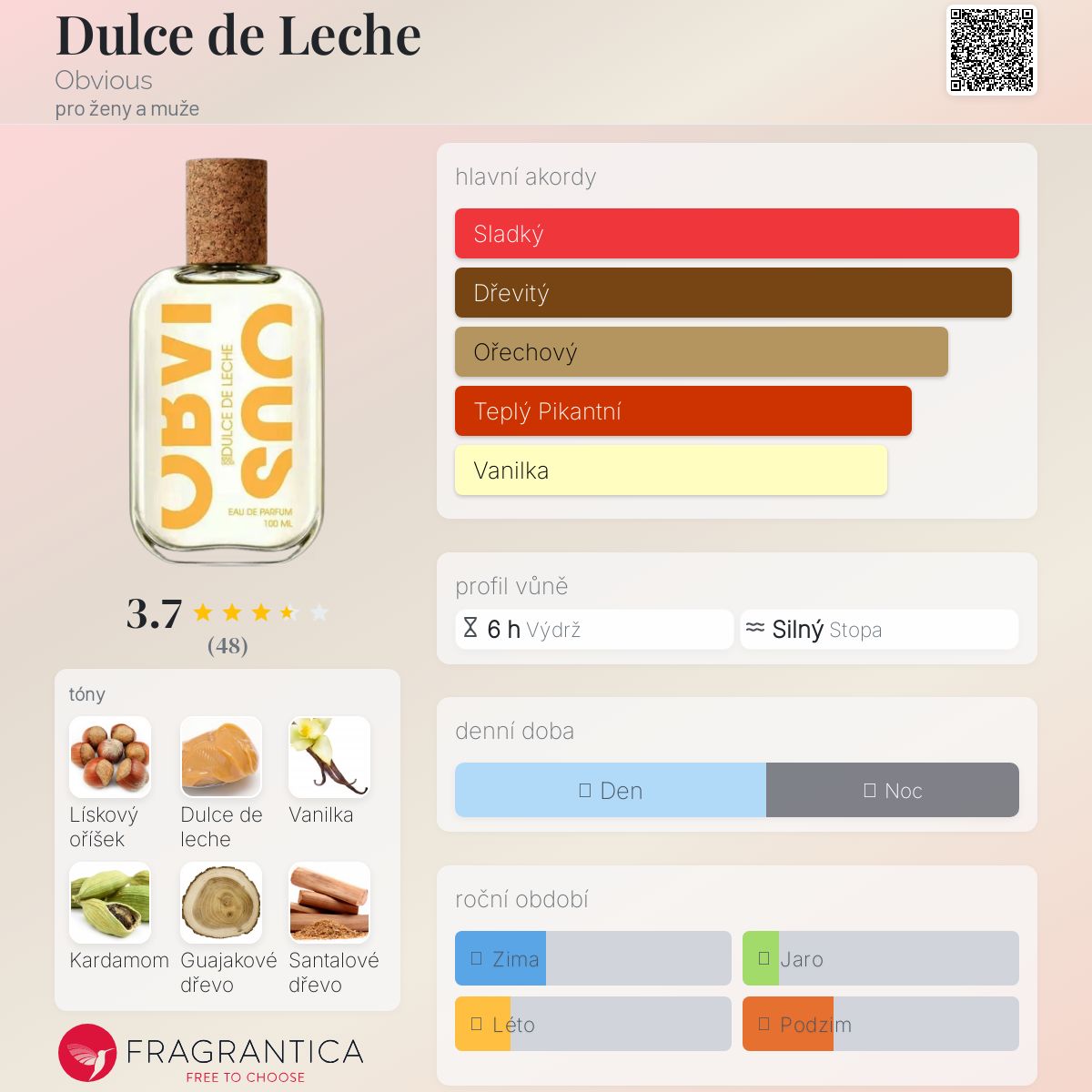 Dulce de Leche podle Obvious je Orientální Vanilla vůně pro ženy a muže. Toto je nová vůně. Dulce de Leche byl/a uveden/a v roce 2025. "Nosem" za touto vůní je Meabh McCurtin. Vrchní tóny jsou Lískový oříšek, Kardamom a Černý pepř; střední tón jeDulce de leche ; základní tóny jsou Vanilka, Guajakové dřevo a Santalové dřevo.
