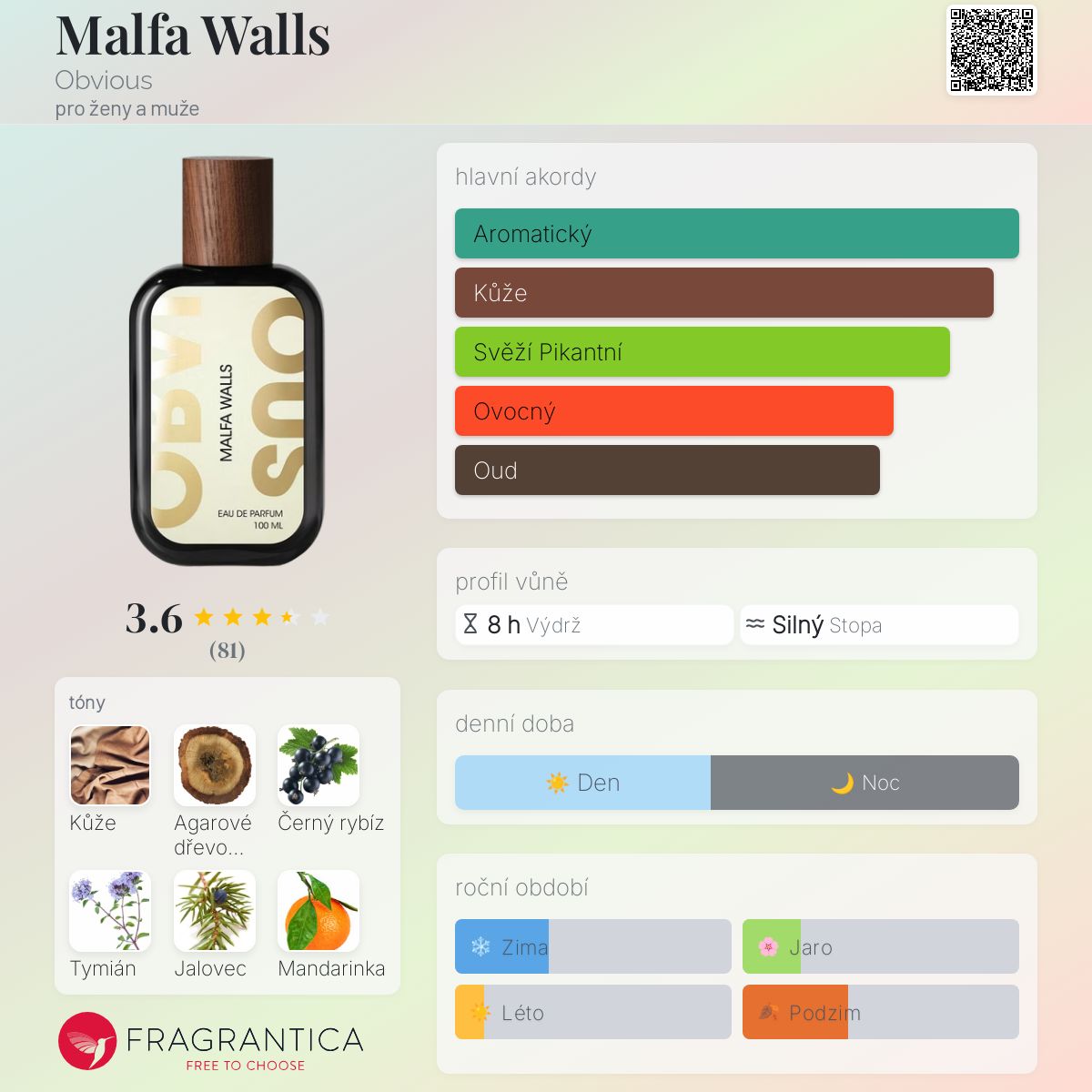 Malfa Walls podle Obvious je Orientální vůně pro ženy a muže. Toto je nová vůně. Malfa Walls byl/a uveden/a v roce 2024. "Nosem" za touto vůní je Julien Rasquinet. Vrchní tóny jsou Černý rybíz, Tymián, Sicilská mandarinka, Sicilský pomeranč a Pomeranč; střední tóny jsouKadidlo a Šalvěj ; základní tóny jsou Kůže, Agarové dřevo (oud) a Jalovec.