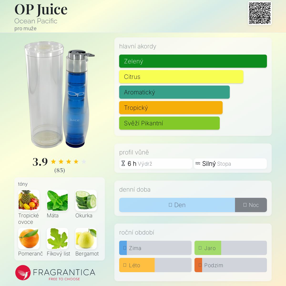 OP Juice podle Ocean Pacific je Citrus Aromatic vůně pro muže. OP Juice byl/a uveden/a v roce 2001. "Nosem" za touto vůní je IFF. Vrchní tóny jsou Havajské ovoce, Okurka, Pomeranč, Bergamot a Kardamom; střední tóny jsouMáta a Fíkový list ; základní tóny jsou Pižmo a Dřevité tóny.