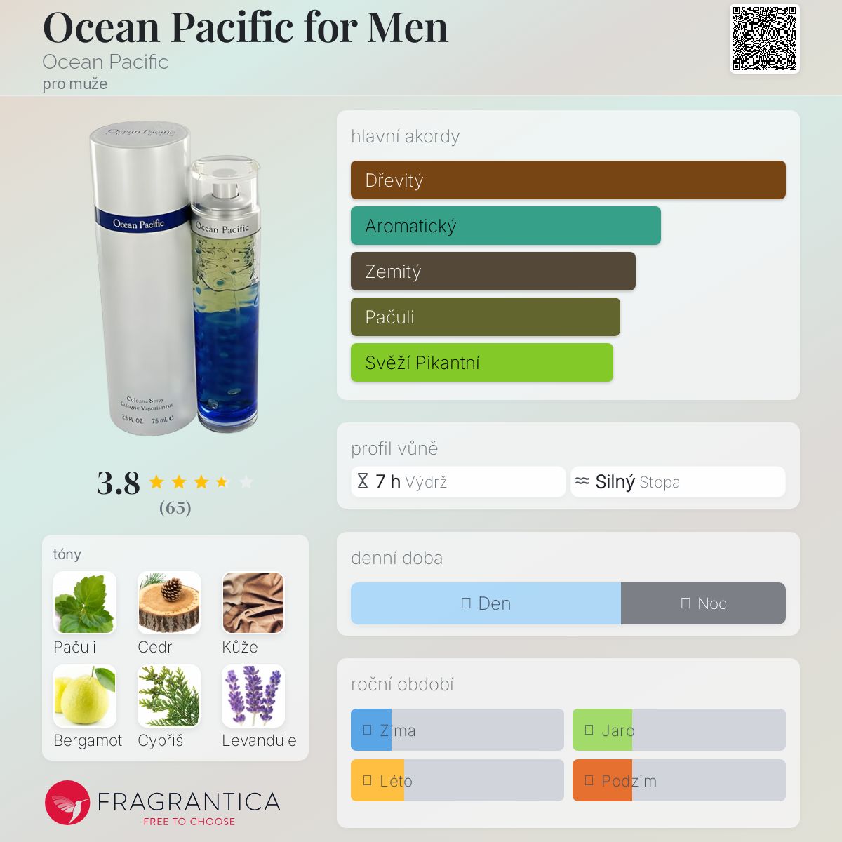 Ocean Pacific for Men podle Ocean Pacific je Woody vůně pro muže. Ocean Pacific for Men byl/a uveden/a v roce 2003. "Nosem" za touto vůní je Jean-Louis Grauby. Vrchní tóny jsou Bergamot, Cypřiš a Levandule; střední tóny jsouCedr, Vetiver, Lotus a Jasmín ; základní tóny jsou Pačuli, Kůže, Dubový mech, Pižmo a Jantar (ambra).