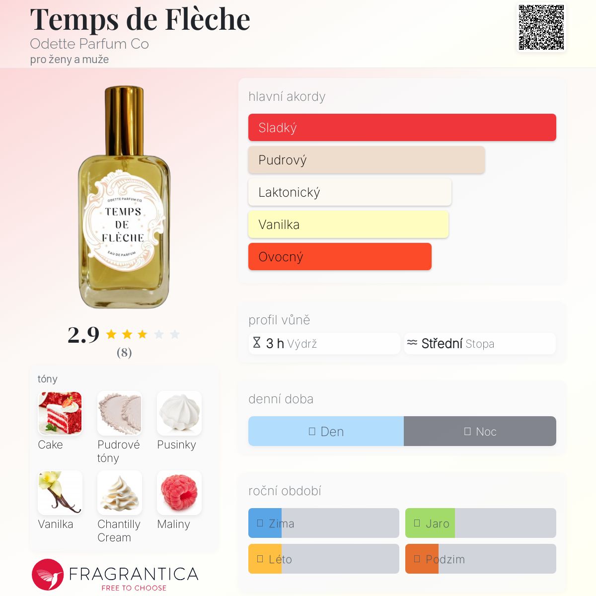 Temps de Flèche podle Odette Parfum Co je Floral Fruity Gourmand vůně pro ženy a muže. Toto je nová vůně. Temps de Flèche byl/a uveden/a v roce 2025. "Nosem" za touto vůní je Odette Fontaine. Vrchní tóny jsou Pudrové tóny, Sněhová pusinka, Vanilka a Mandloň; střední tóny jsouDort, Šlehačka Chantilly, Maliny a Sladké tóny ; základní tóny jsou Mléko, Vanilkový lusk, Máslo, Vanilka, Fazole tonka, Santalové dřevo a Bílé pižmo.