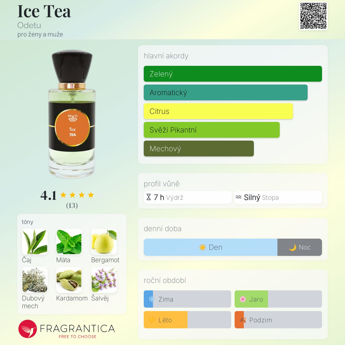 Ice Tea podle Odetu je Aromatic Green vůně pro ženy a muže. Ice Tea byl/a uveden/a v roce 2020. "Nosem" za touto vůní je Andrey Chibisov. Vrchní tóny jsou Máta, Bergamot, Kardamom a Citrón; střední tóny jsouZelený čaj, Šalvěj a Petitgrain ; základní tóny jsou Dubový mech, Ambra, Muškátový oříšek a Pižmo.