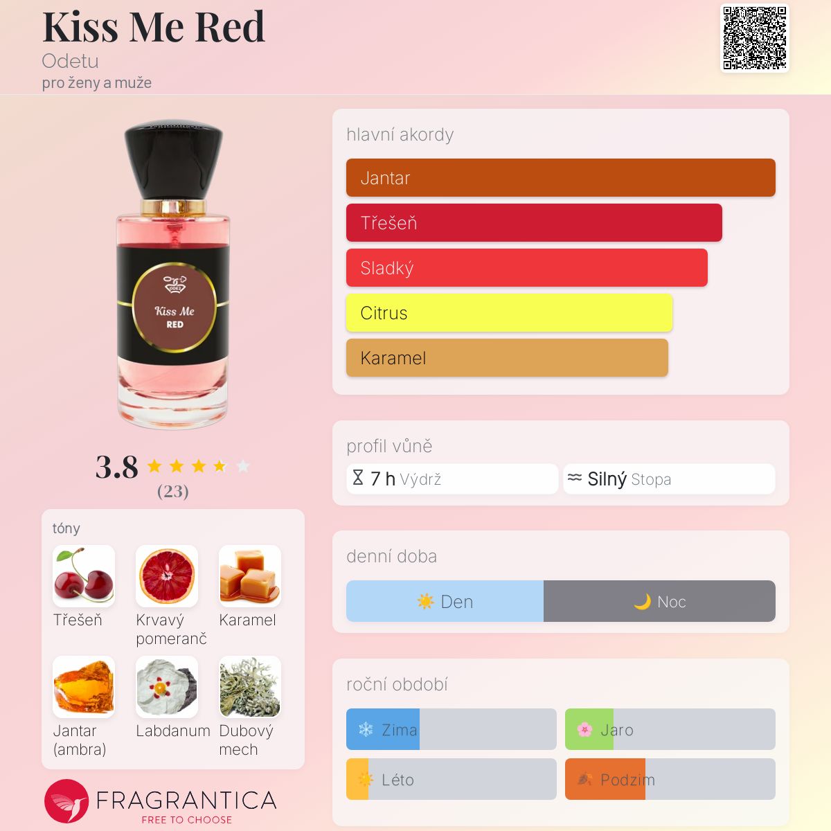 Kiss Me Red podle Odetu je Chypre Fruity vůně pro ženy a muže. Kiss Me Red byl/a uveden/a v roce 2020. "Nosem" za touto vůní je Andrey Chibisov. Vrchní tón je Krvavý pomeranč ; střední tóny jsouTřešeň, Jantar (ambra) a Růže ; základní tóny jsou Karamel, Labdanum a Dubový mech.