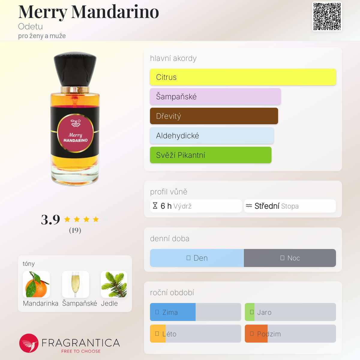 Merry Mandarino podle Odetu je Citrus vůně pro ženy a muže. Merry Mandarino byl/a uveden/a v roce 2022. "Nosem" za touto vůní je Andrey Chibisov. Vrchní tón je Mandarinka ; střední tón jeŠampaňské ; základní tón je Jedle.