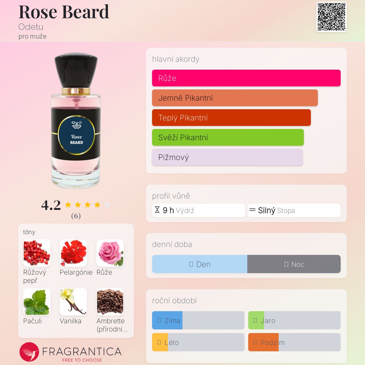 Rose Beard podle Odetu je Orientální vůně pro muže. Toto je nová vůně. Rose Beard byl/a uveden/a v roce 2024. "Nosem" za touto vůní je Andrey Chibisov. Vrchní tóny jsou Šafrán a Med; střední tóny jsouRůžový pepř, Pelargónie a Růže ; základní tóny jsou Pačuli, Vanilka, Ambrette (přírodní pižmo) a Jantar (ambra).