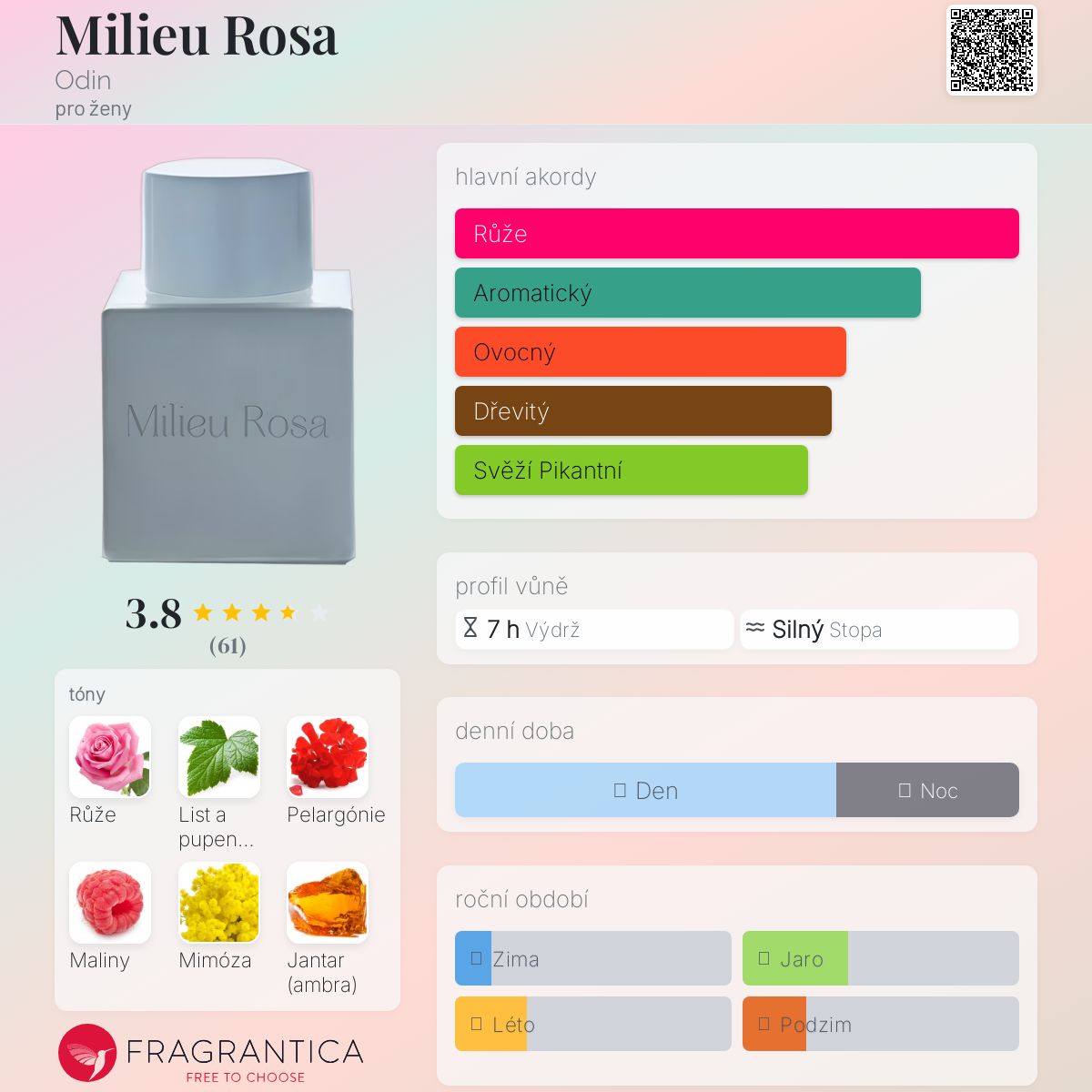 Milieu Rosa podle Odin je Floral vůně pro ženy. Milieu Rosa byl/a uveden/a v roce 2014. "Nosem" za touto vůní je Jean Claude Delville. Vrchní tóny jsou Marocká růže, Černý rybíz, Maliny a Mimóza; střední tóny jsouKvětná růže, Pelargónie a Jasmín ; základní tóny jsou Růže, Jantar (ambra), Dub, Vetiver a Dřevité tóny.