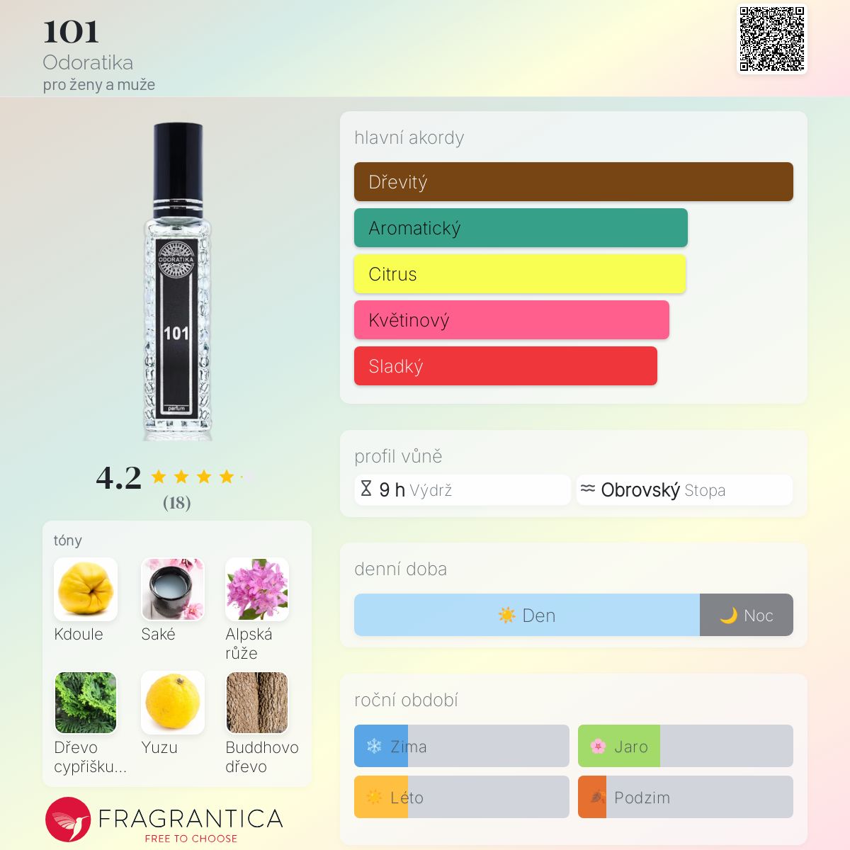 101 podle Odoratika je Citrus Aromatic vůně pro ženy a muže. 101 byl/a uveden/a v roce 2019. "Nosem" za touto vůní je Valeria Karmanova. Vrchní tóny jsou Kdoule, Citrón, Mandarinka a Rebarbora; střední tóny jsouSaké, Alpská růže, Dřevo cypřišku tupolistého a Cypřiš ; základní tóny jsou Yuzu, Buddhovo dřevo, Bambus, Zimostráz, Grapefruit, Olibanum, Jantar (ambra) a Labdanum.