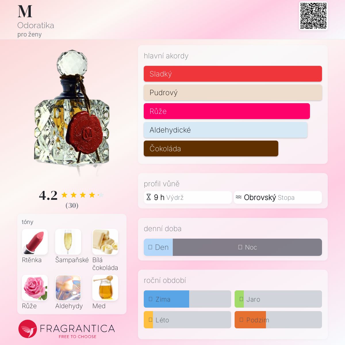 M podle Odoratika je Floral Aldehyde vůně pro ženy. M byl/a uveden/a v roce 2019. "Nosem" za touto vůní je Valeria Karmanova. Vrchní tóny jsou Šampaňské a Bílá čokoláda; střední tóny jsouRůže, Okvětní lístky růží, Aldehydy a Arum lilie ; základní tóny jsou Rtěnka, Med, Hrozny Pinot Noir, Hořká čokoláda, Bourbonská vanilka, Pižmo, Bílá lilie a Jasmín Sambac.