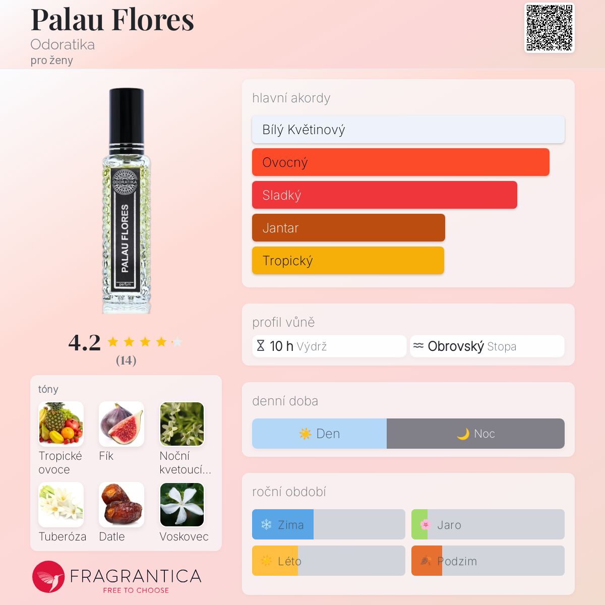 Palau Flores podle Odoratika je Orientální Floral vůně pro ženy. Palau Flores byl/a uveden/a v roce 2019. "Nosem" za touto vůní je Valeria Karmanova. Vrchní tóny jsou Tropické ovoce, Fík a Růžový pepř; střední tóny jsouNoční kvetoucí jasmín, Tuberóza, Voskovec a Karo Karounde ; základní tóny jsou Datle, Bílý oud, Vanilka, Pryskyřice ze dřeva, Olibanum, Jantar (ambra), Tabák a Vetiver.