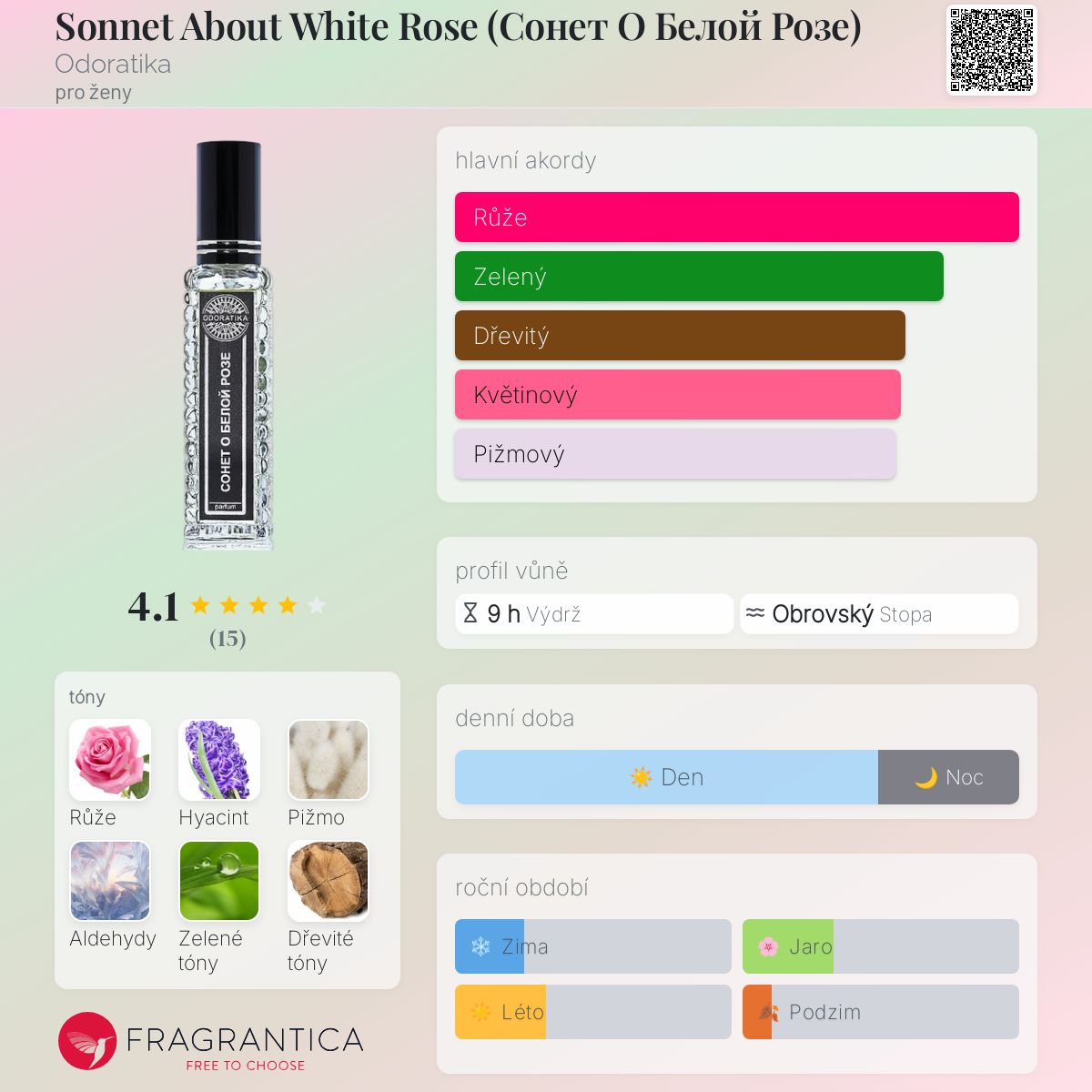 Sonnet About White Rose (Сонет О Белой Розе) podle Odoratika je Floral Aldehyde vůně pro ženy. Sonnet About White Rose (Сонет О Белой Розе) byl/a uveden/a v roce 2016. "Nosem" za touto vůní je Valeria Karmanova. Vrchní tóny jsou Hyacint, Aldehydy, Sladký pomeranč, Maté a Jedle; střední tón jeRůže de Mai ; základní tóny jsou Růže, Bílé pižmo, Zelené tóny, Vzácné dřevo, Jantar (ambra), Kastoreum, Gurjanský balzám a Copaiba balzám.